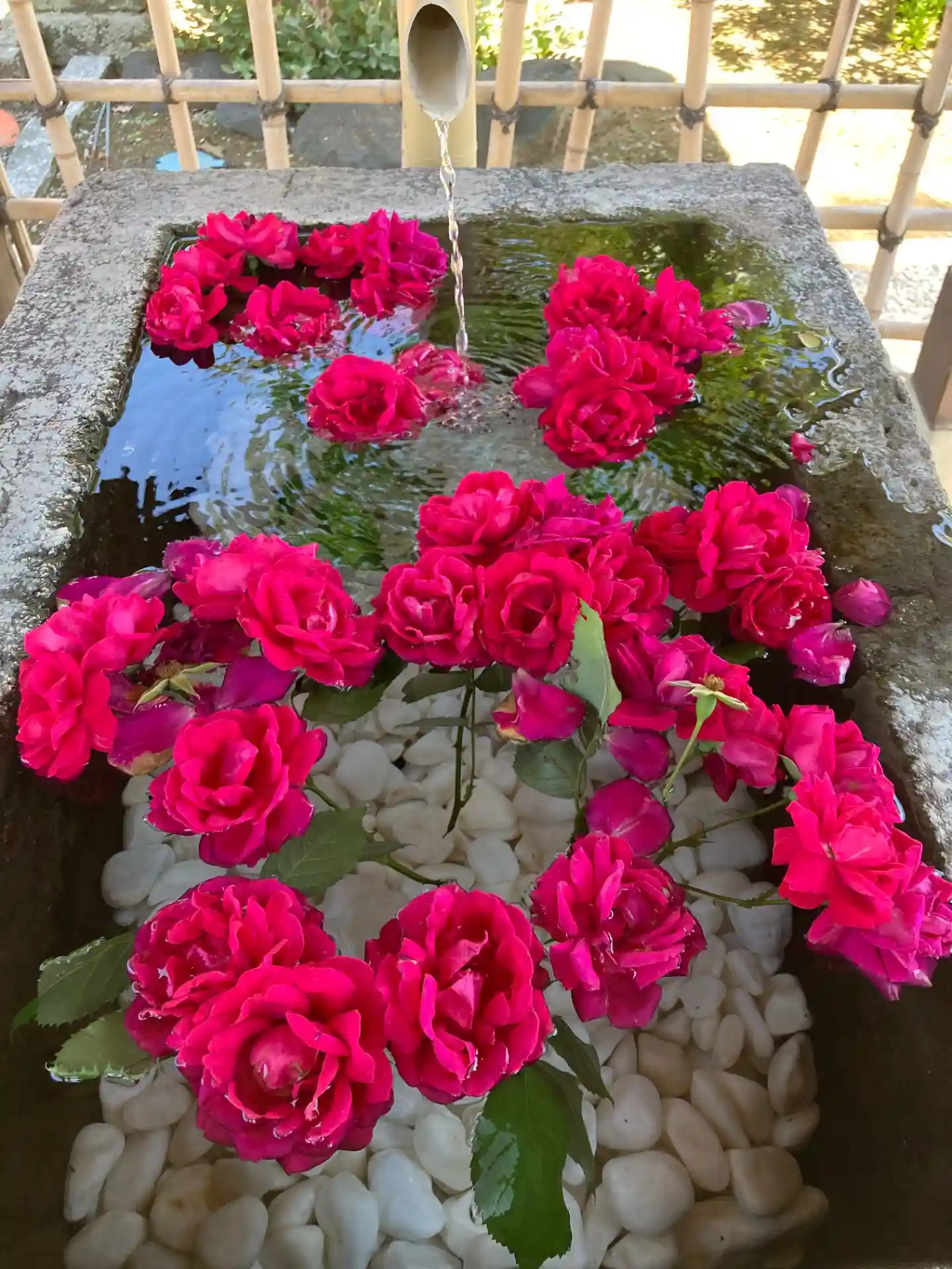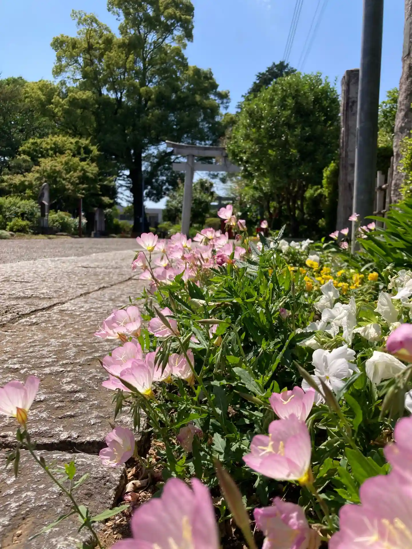 つつじが岡公園の隣で公園と繋がります。天気が良くて花も咲いて参道は綺麗でした。手水舎はバラが。