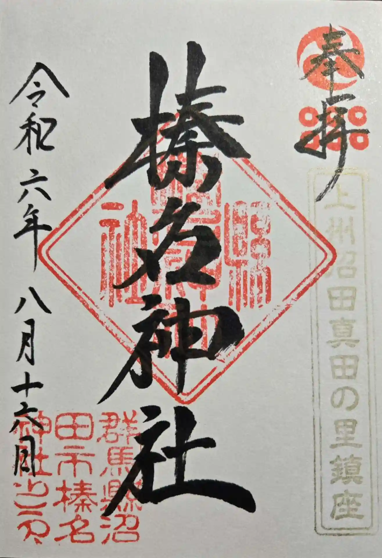 沼田は真田家ゆかりの地とのことで、神社本殿の御扉上の桁に描かれた六文銭は真田家の家紋だそうです。