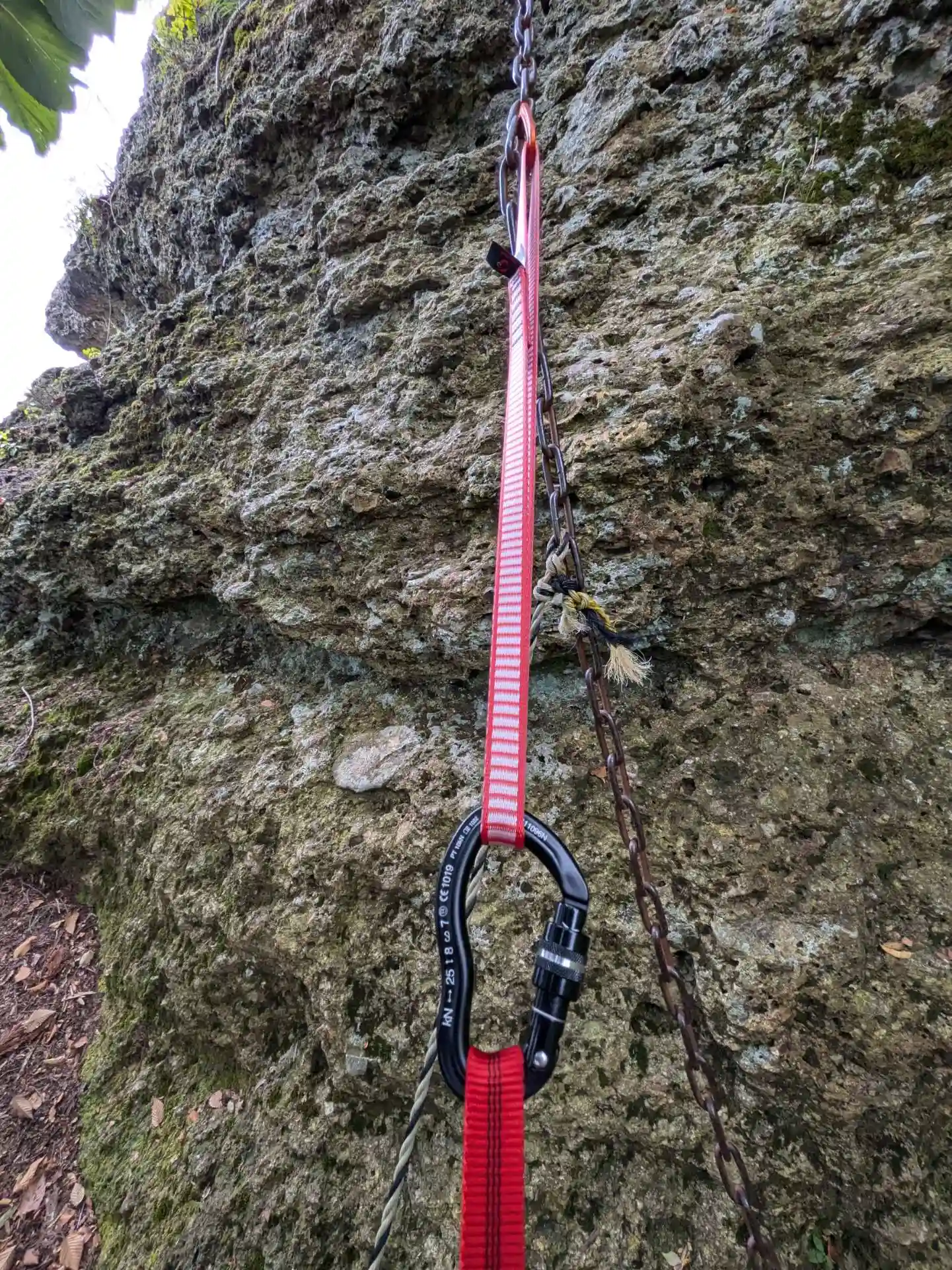 今回は“簡易ハーネス(YouTube参考)”を付けて安全確保の練習(この場で)をしてから登りました。鎖側に付けるカラビナは細い方が引っ掛け易いです。但し、登山用のカラビナが必要です残念ながら100均の物は規格外なので使えません。クライミング用カラビナには、必ず「UIAA」または「CE」マークが付いています。スリングは幅18mmの120cmと60cmにしました(身長約170cm)。