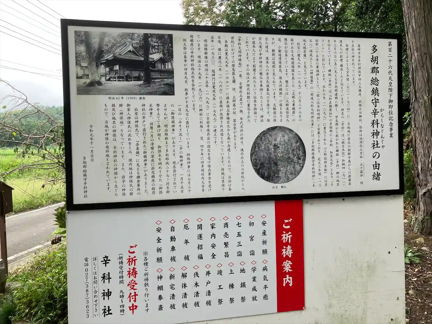 辛科神社及び韓級郷は多胡郡が設置されたのを記念として作られた「多胡碑」に記されており、韓級郷が渡来人系の民族が居住していた考察から、日本における他国の民族との交流を記した"漢文"表記の貴重な史料として多胡碑は国の特別史跡に指定されています。またこの他にも山ノ上碑・金井沢碑と共に「上野三碑」としてまとめられています。