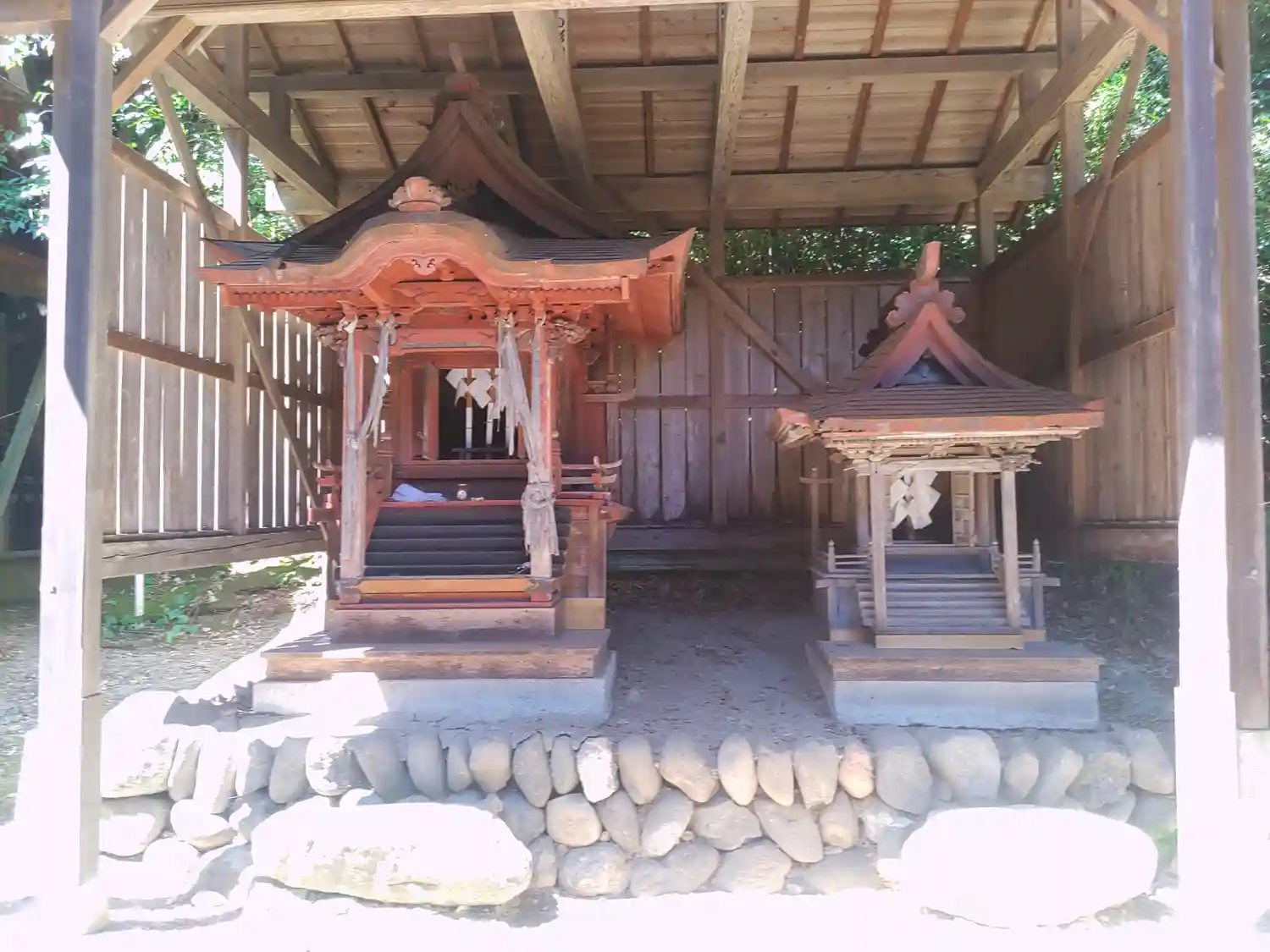 ただ、社殿左側にある境内社群は、せっかく屋根に覆われているのに、ほとんどの社殿が一部損壊している...(でも紙垂が綺麗だったりする。)
