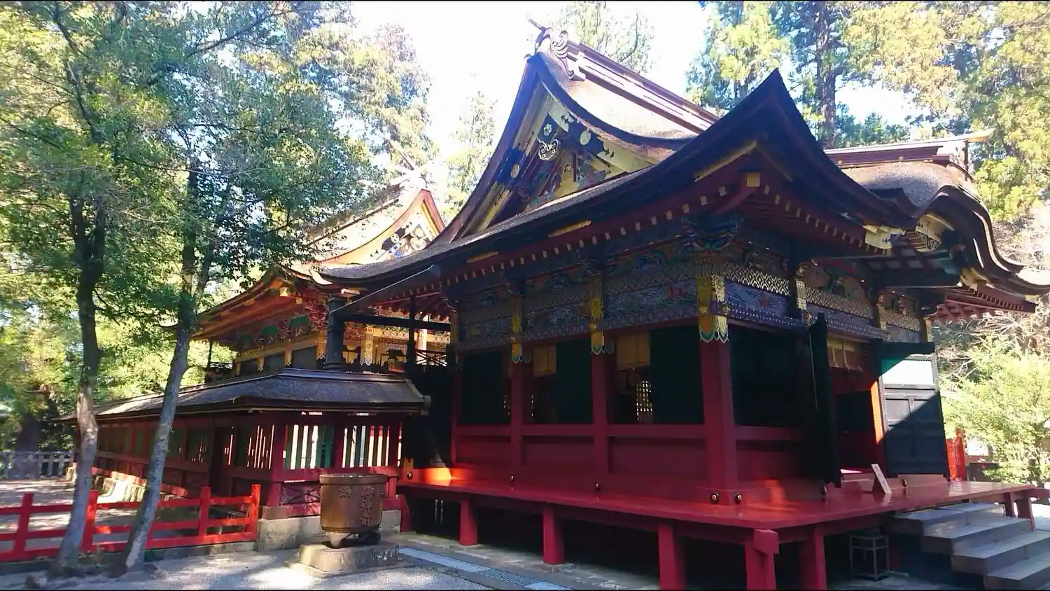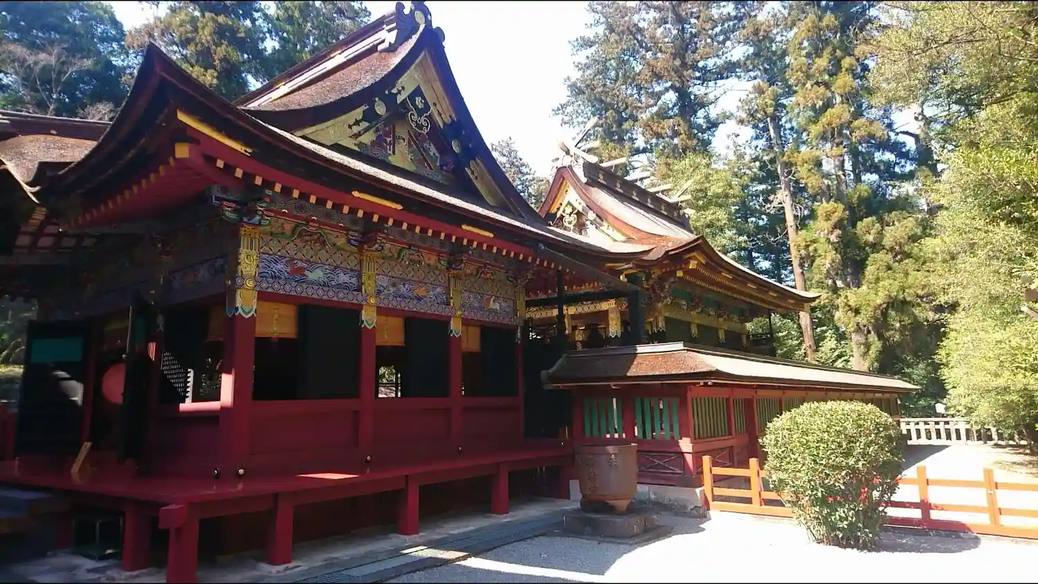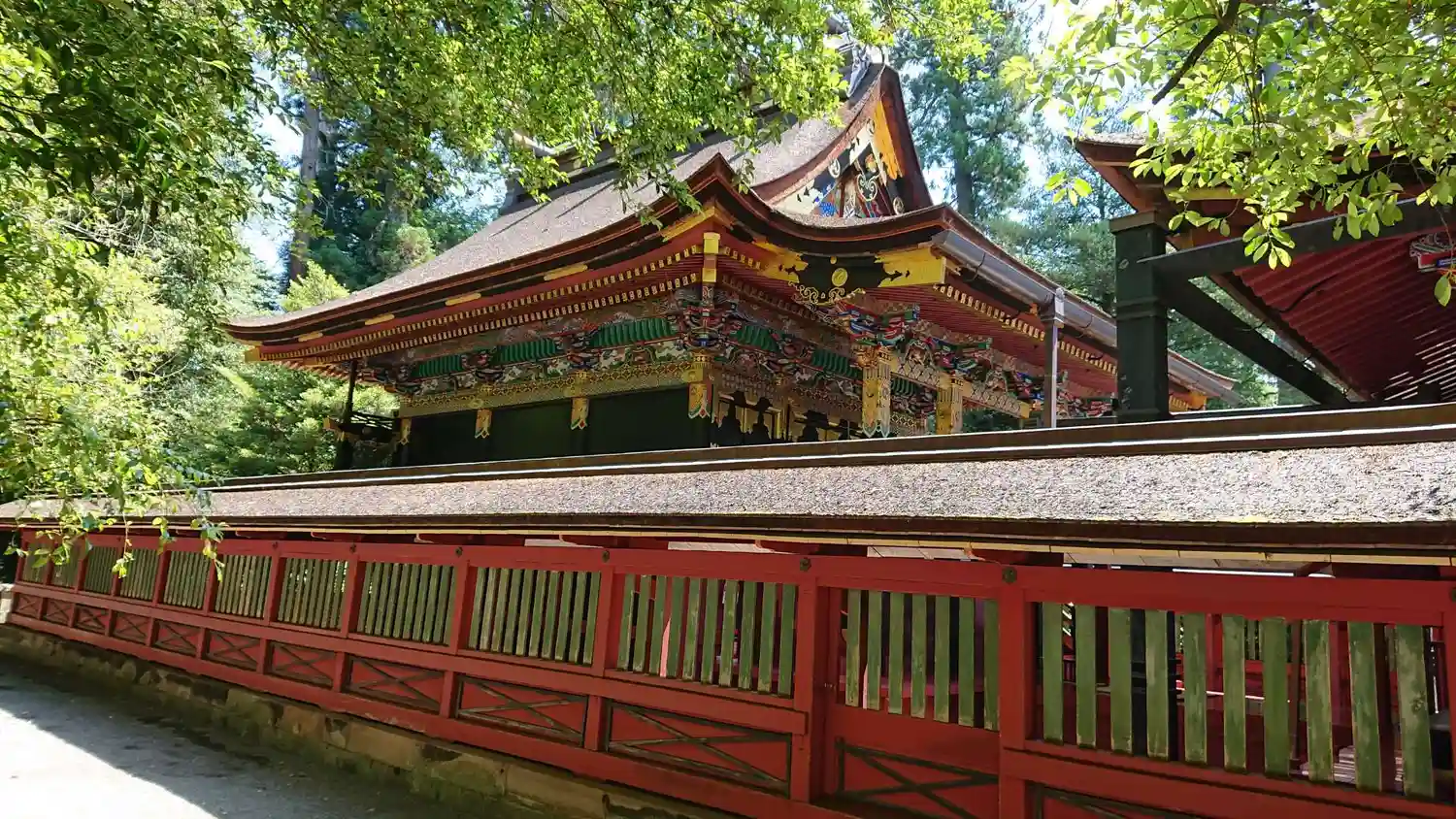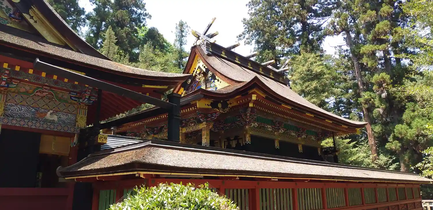 なお、拝殿、幣殿、本殿、回廊は、江戸幕府3代将軍・徳川家光により1635年に造営、5代将軍綱吉により1698年に改修。この改修時に極彩色の漆が塗られ華麗な造りとなっている。いずれも国指定の重要文化財。