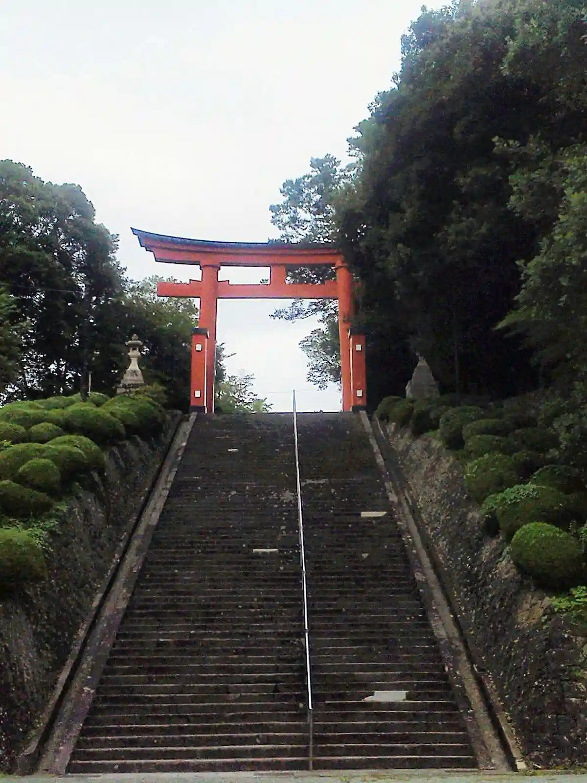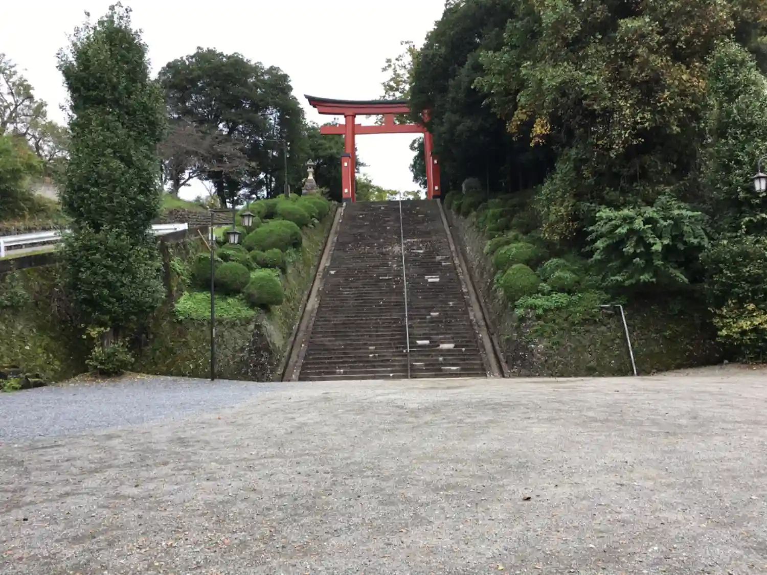 参道を登って行くと、途中で踊り場のような場所がある。ここから歩行者は鳥居までの階段を登る。クルマは写真枠外左にある急峻な道を登っていく。