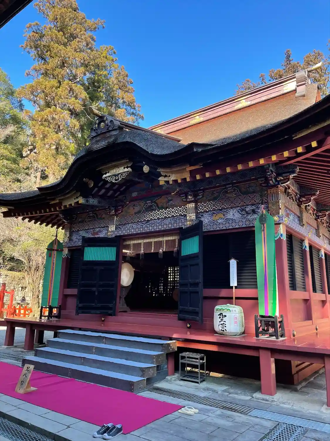 <拝殿>正面。極彩色の漆塗りが極めて美しい。