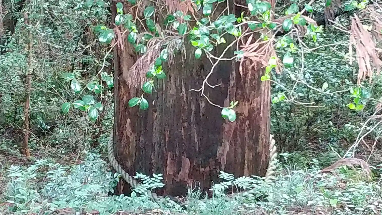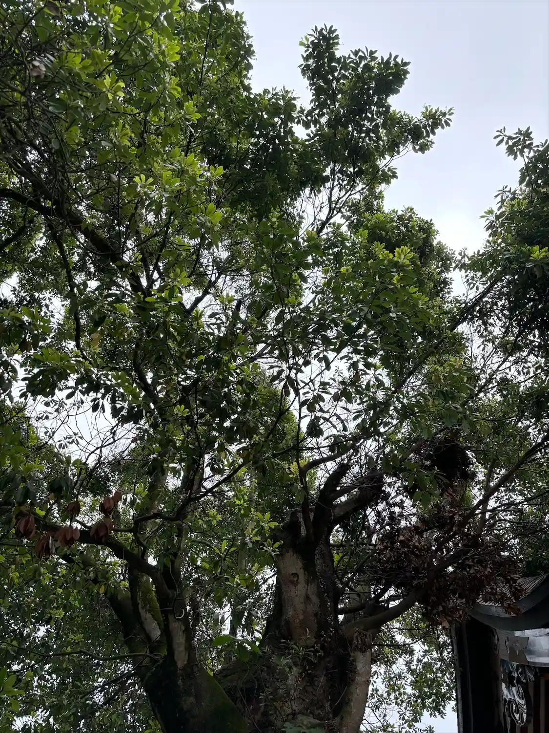 仮殿敷地の入口、西門近くにある<スダジイ>の古木。樹高15m、根回り4m、枝張り東西20m、南北18m、推定樹齢1000年。