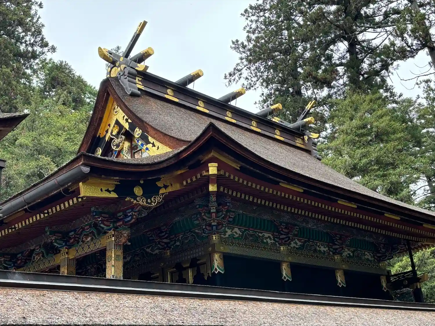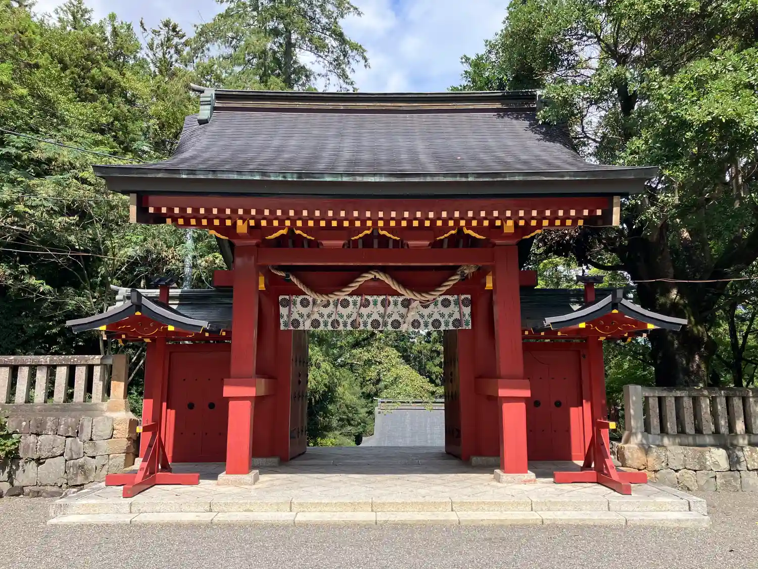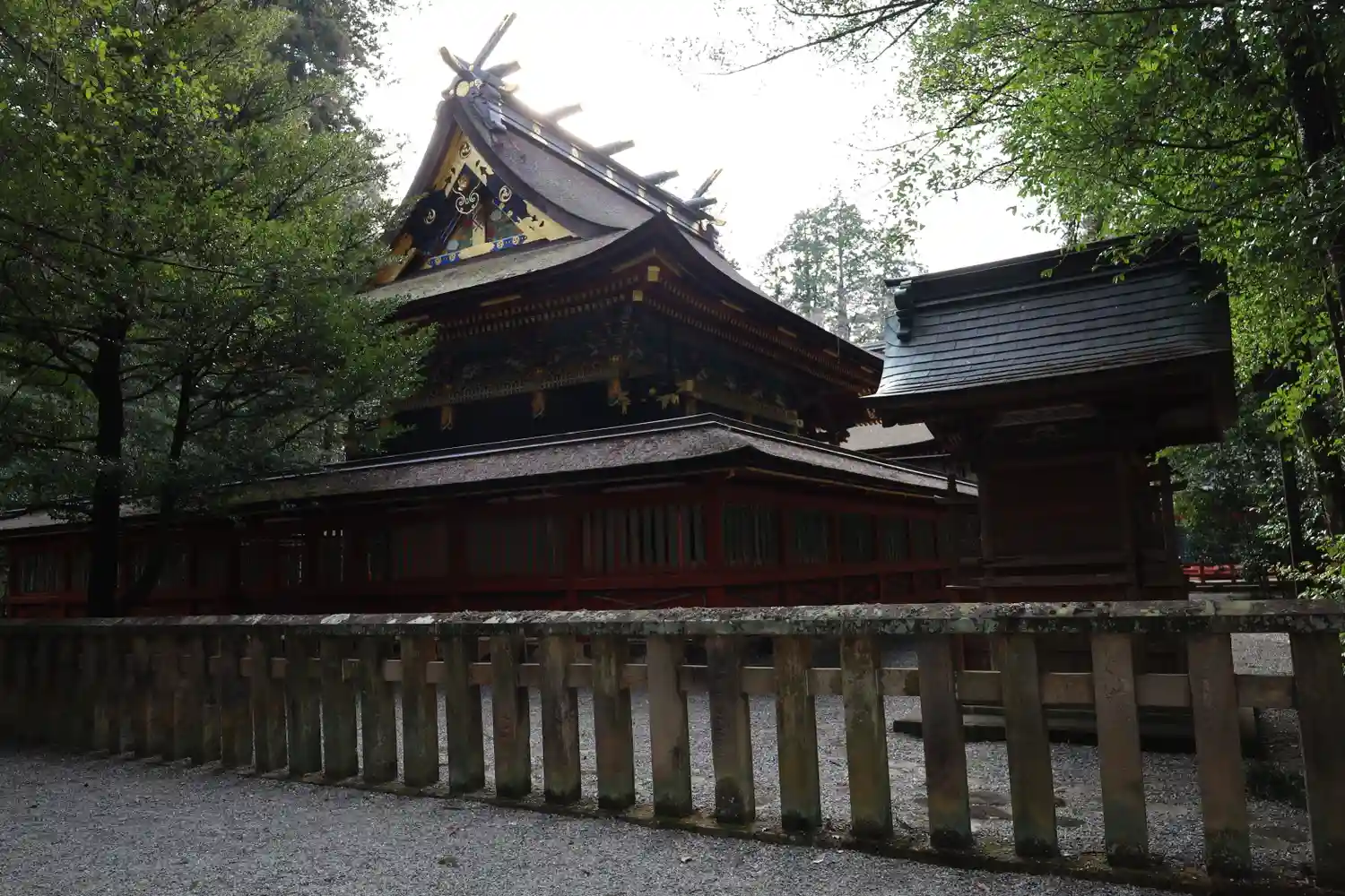 <下り宮>なので、総門の向こうには参道は見えず、<楼門>の屋根と森の木々が見える。