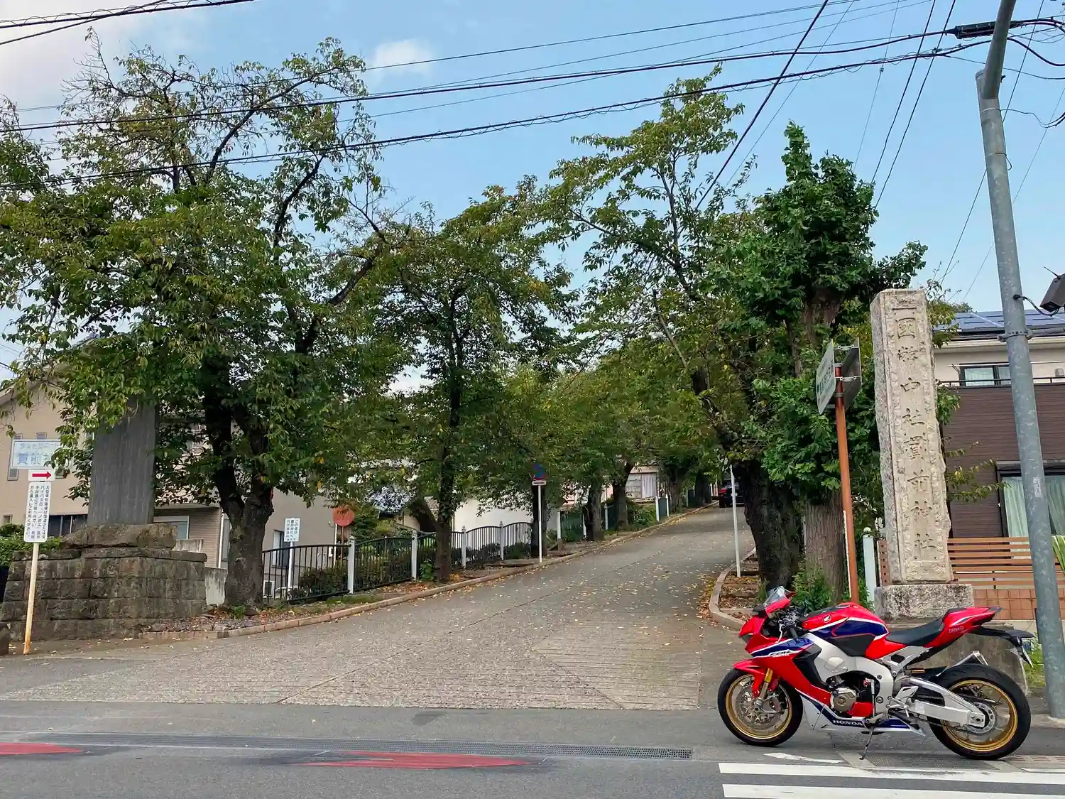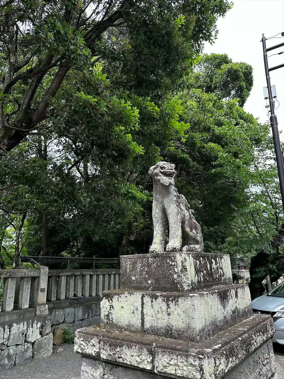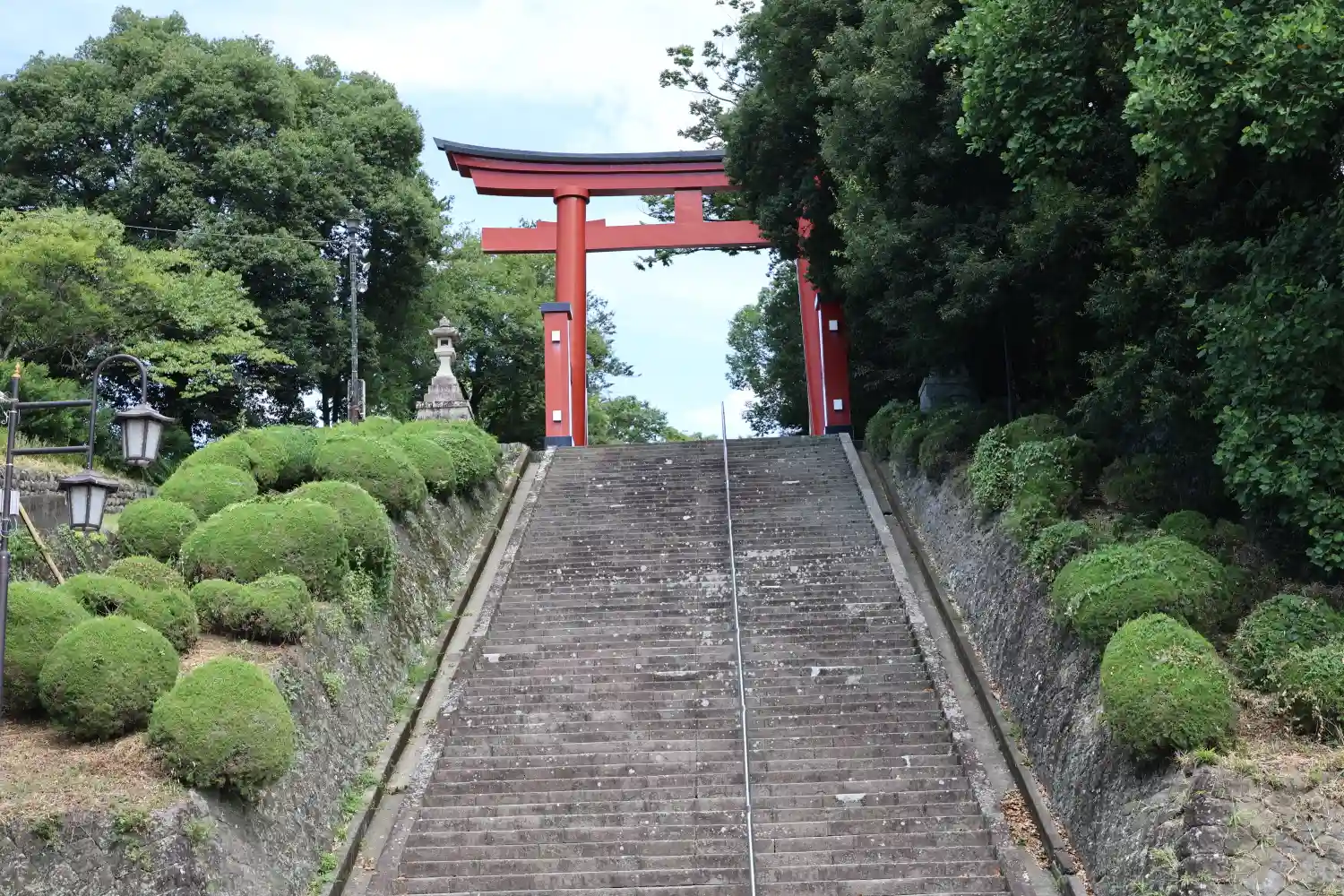 境内南端の入口。県道198号線沿いにあって、<社号標>はあるが、地味で目立たない。ここから参道を徐々に登って行くが、面白いことにこの参道は県道209号線という公道。参拝者のクルマだけではなく、関係のないクルマも走っている。