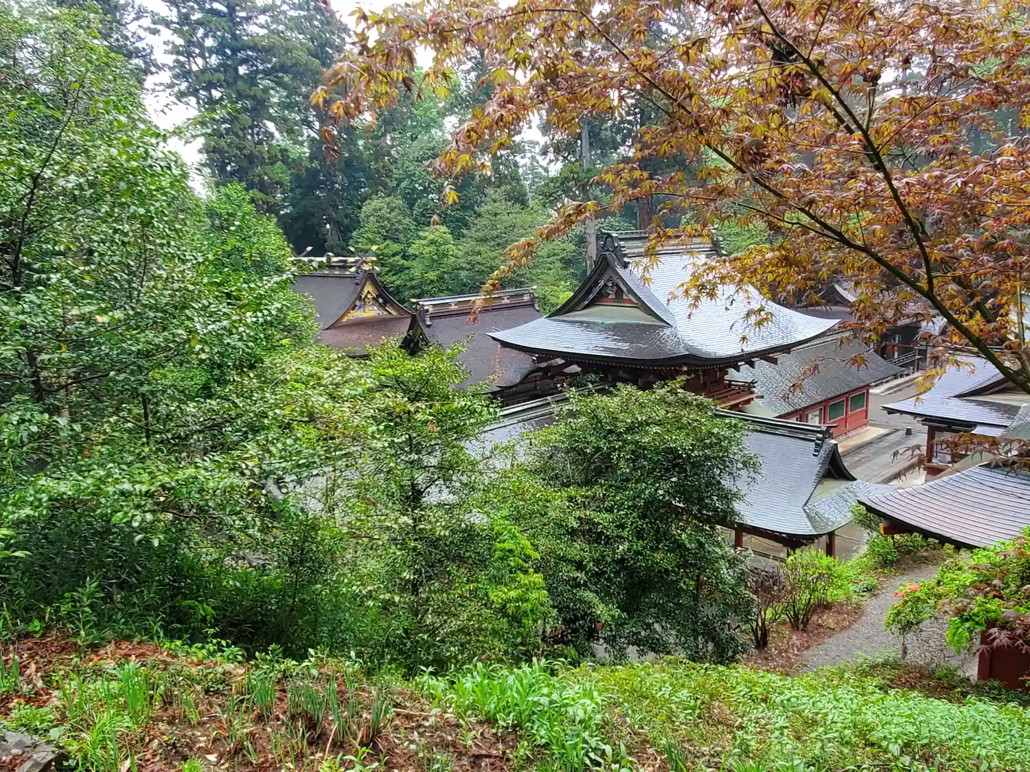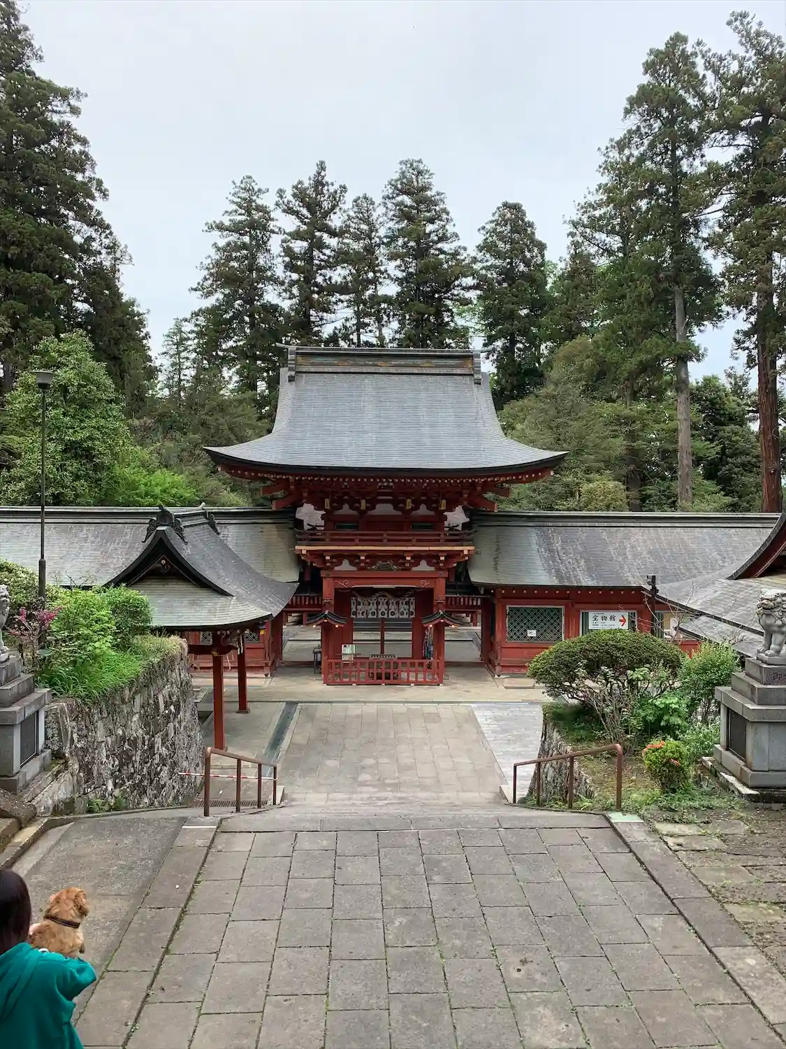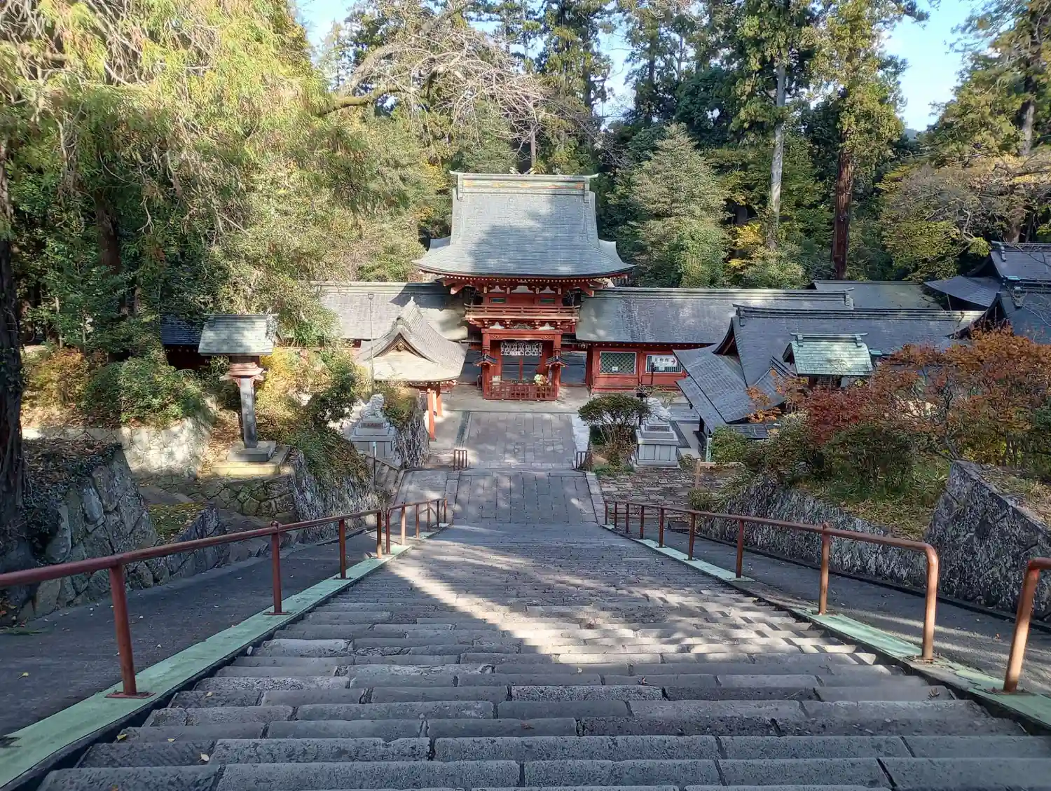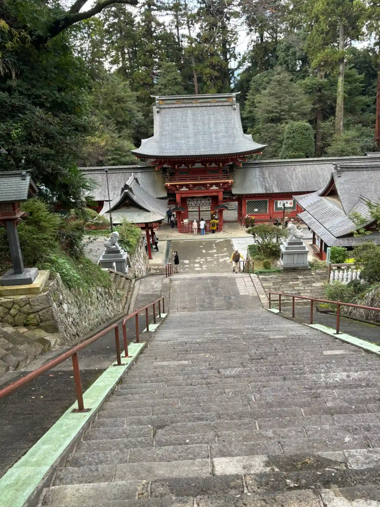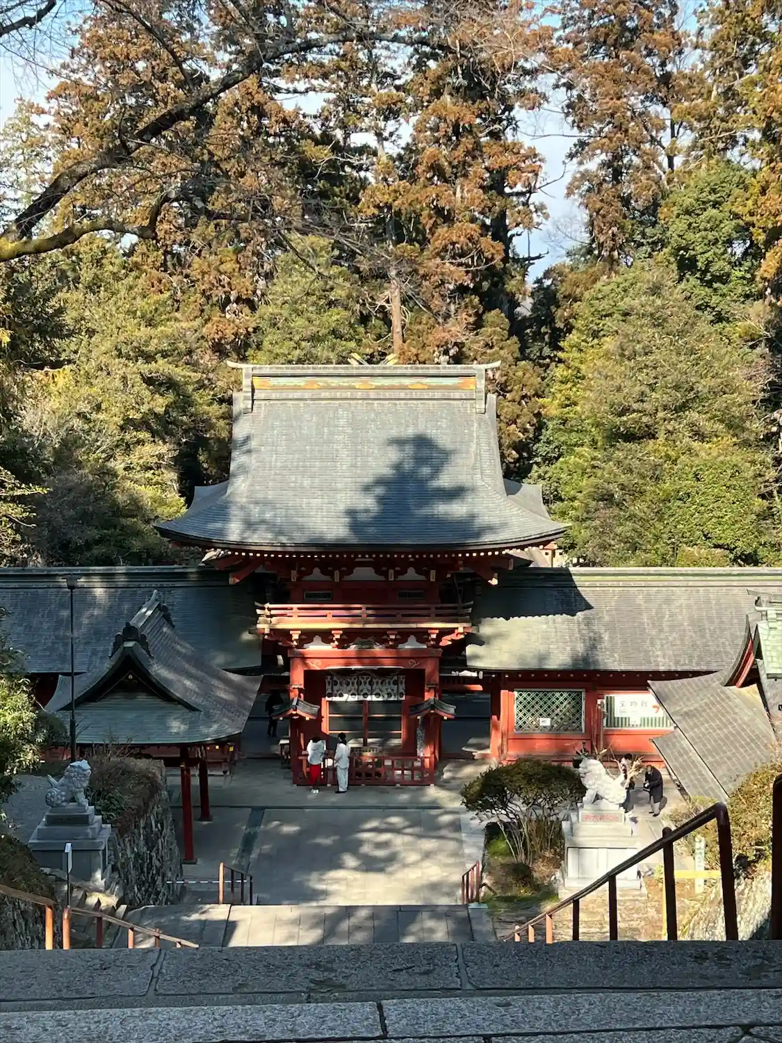 <楼門>2階ぐらいの高さまで下ってからのショット。楼門と回廊(翼廊)は江戸3代将軍徳川家光による造営。いずれも国指定の重要文化財。