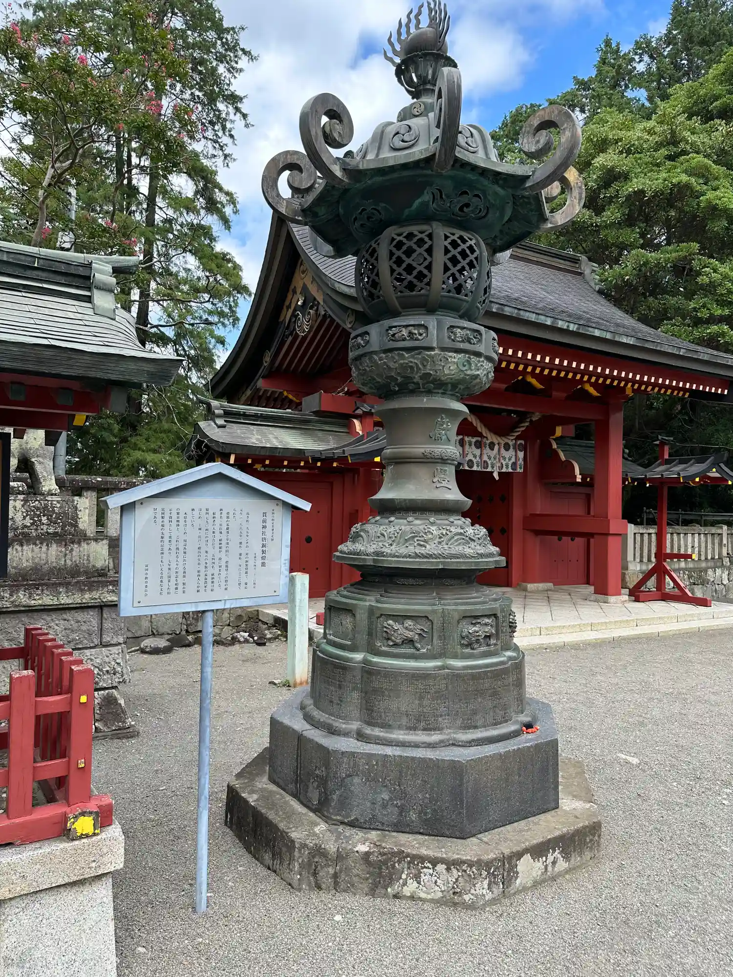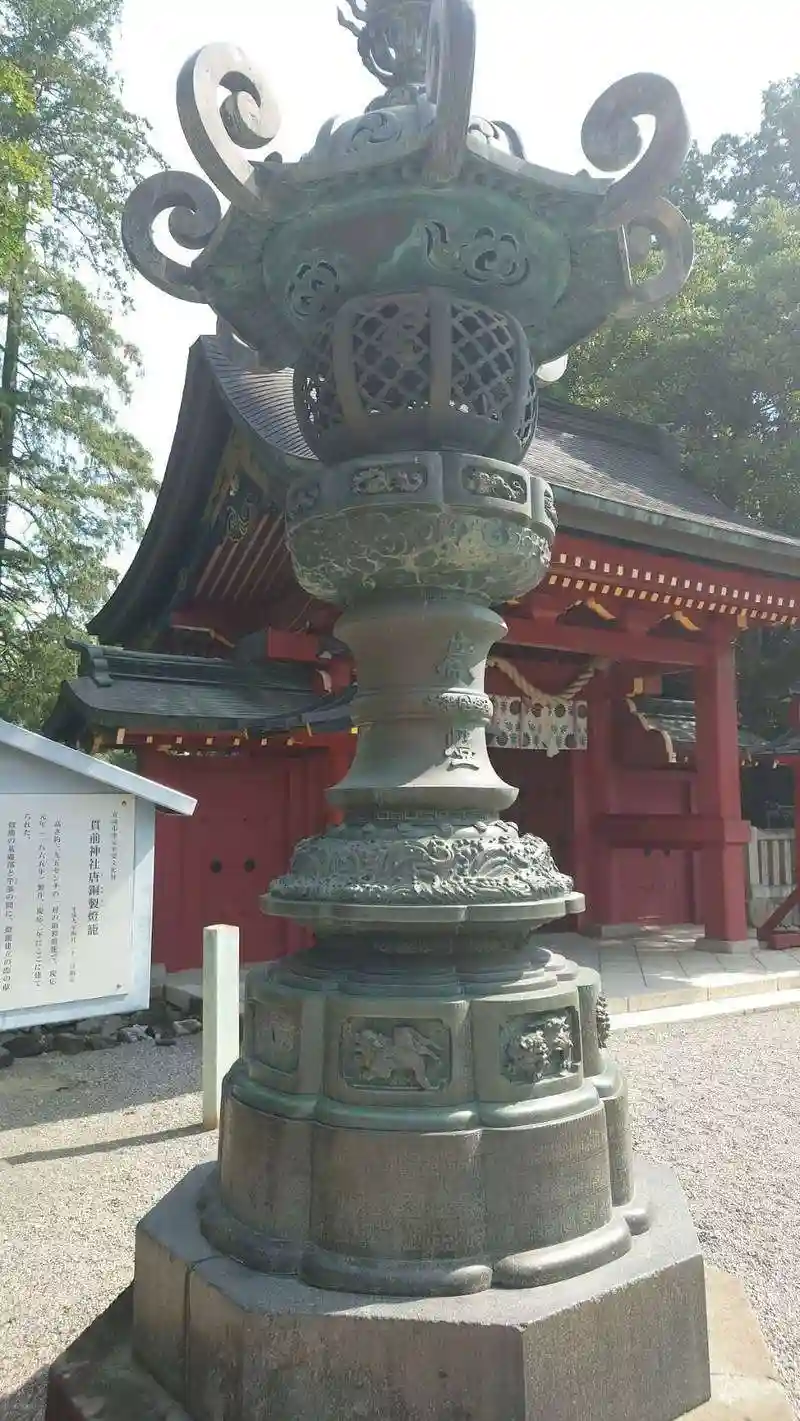 青銅燈籠は、江戸時代末期1865年の作。表面に寄進者の名前がたくさん細かく彫り込まれている。