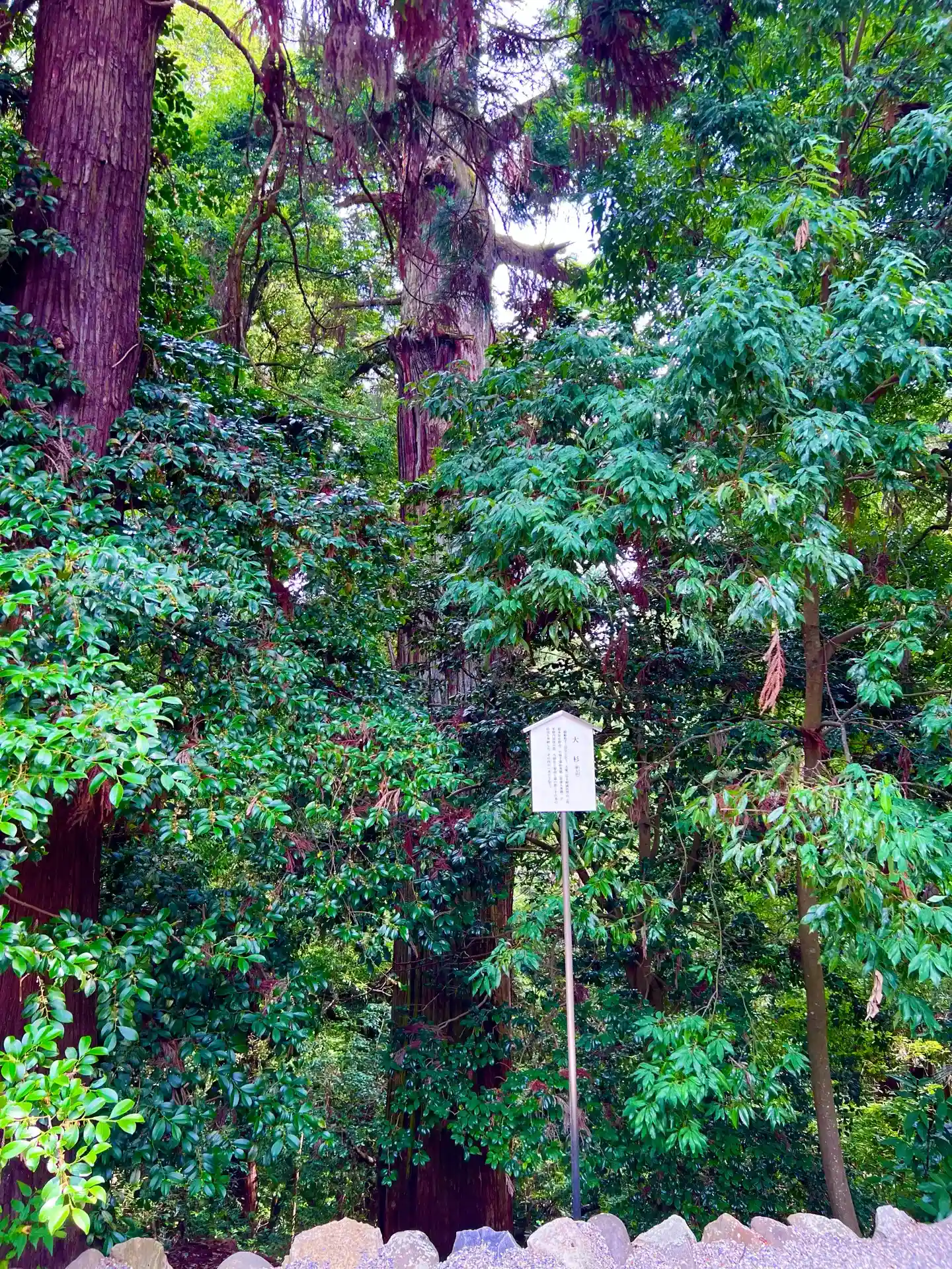 社殿の裏にある<大杉(藤太杉)>。樹齢1000年超。平安爺大中期の939年下野國唐沢山城主・藤原秀郷が平家討伐の際、当社に参詣し、歳の数36本の杉の苗木を奉納したとのこと。