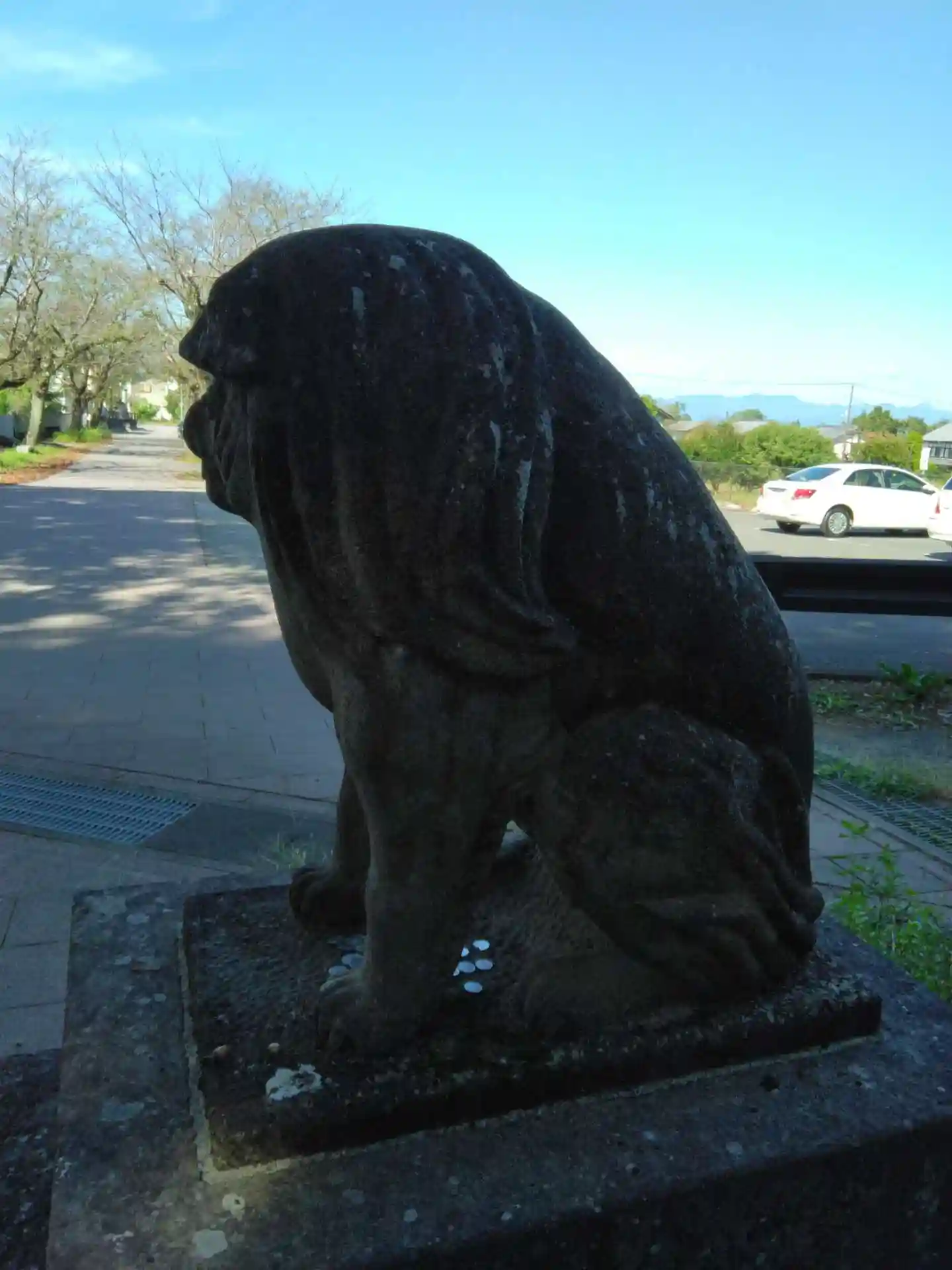 鳥居前の狛犬さん。ネットでも話題の「困った顔の狛犬」です。