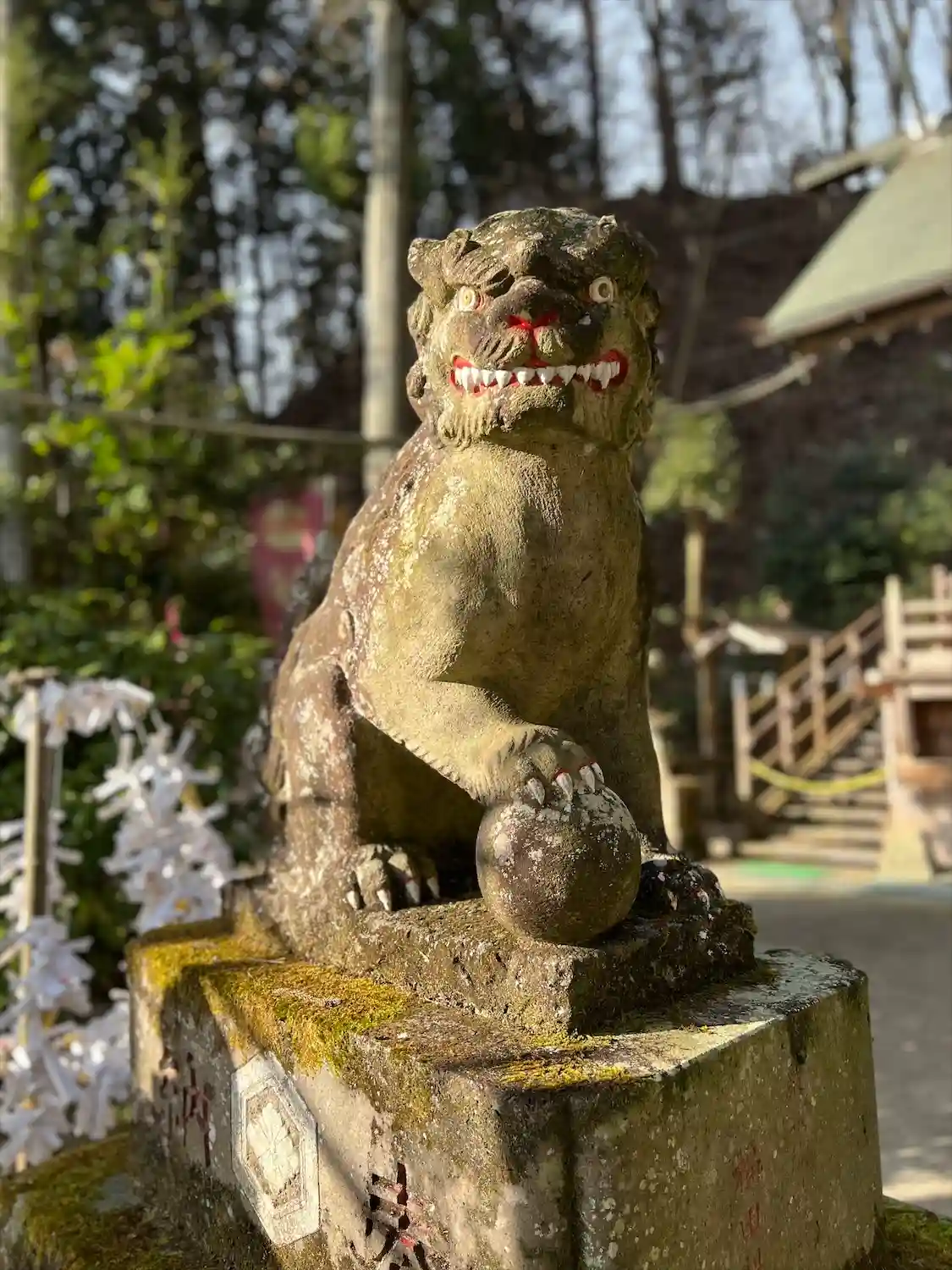 三の鳥居をくぐると、目の前にかなり急な階段が伸びる。両側の狛犬は、こちらも色付き。