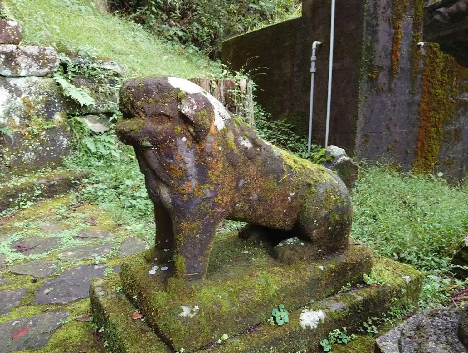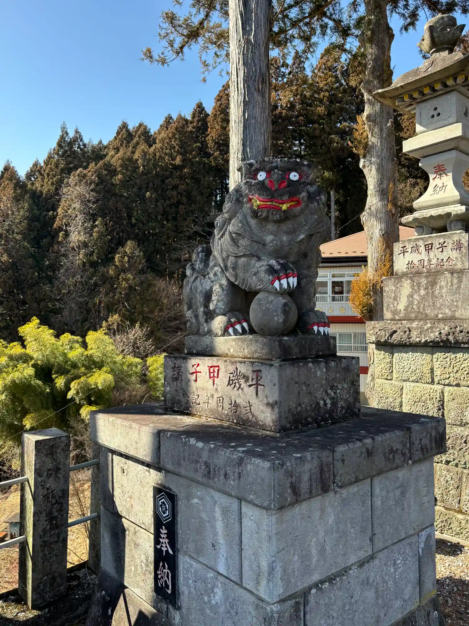 もう少し進むと、少し派手な<狛犬>。刻まれた字体が旧字体なのでかなり古そうだが、部分的にペイントが入っている...