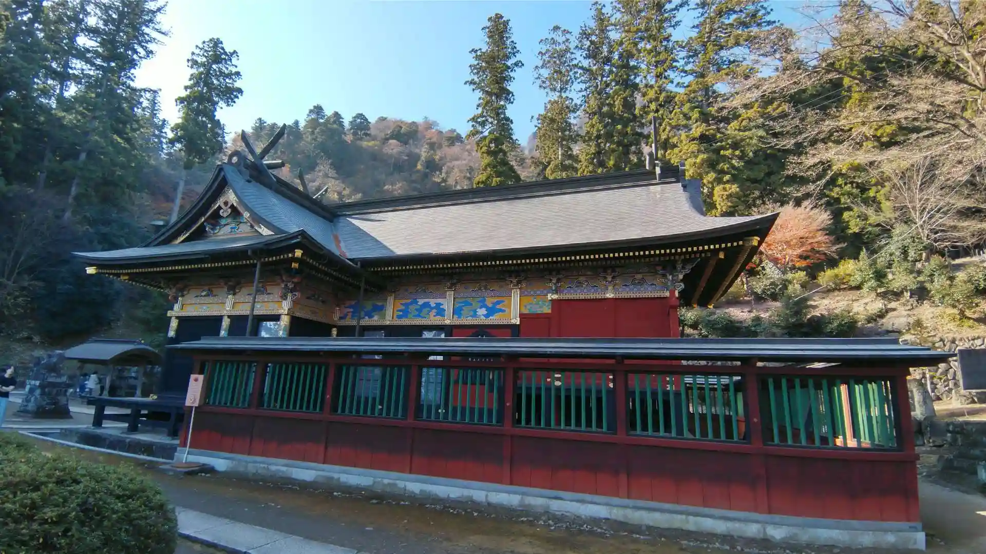 社殿は赤い策で囲まれてます