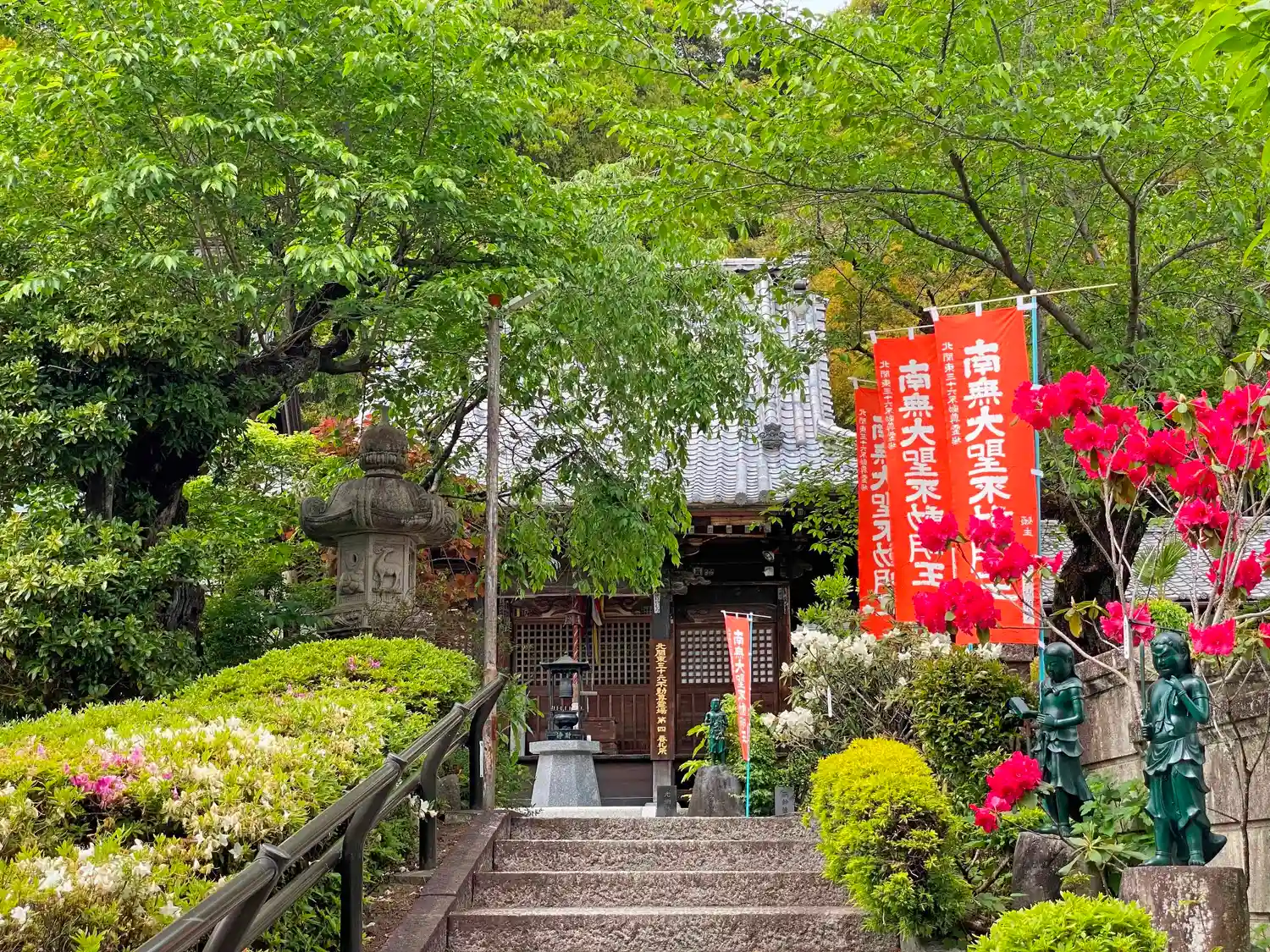 仁王門をくぐる。境内には、たくさんの幟や草花が見える。