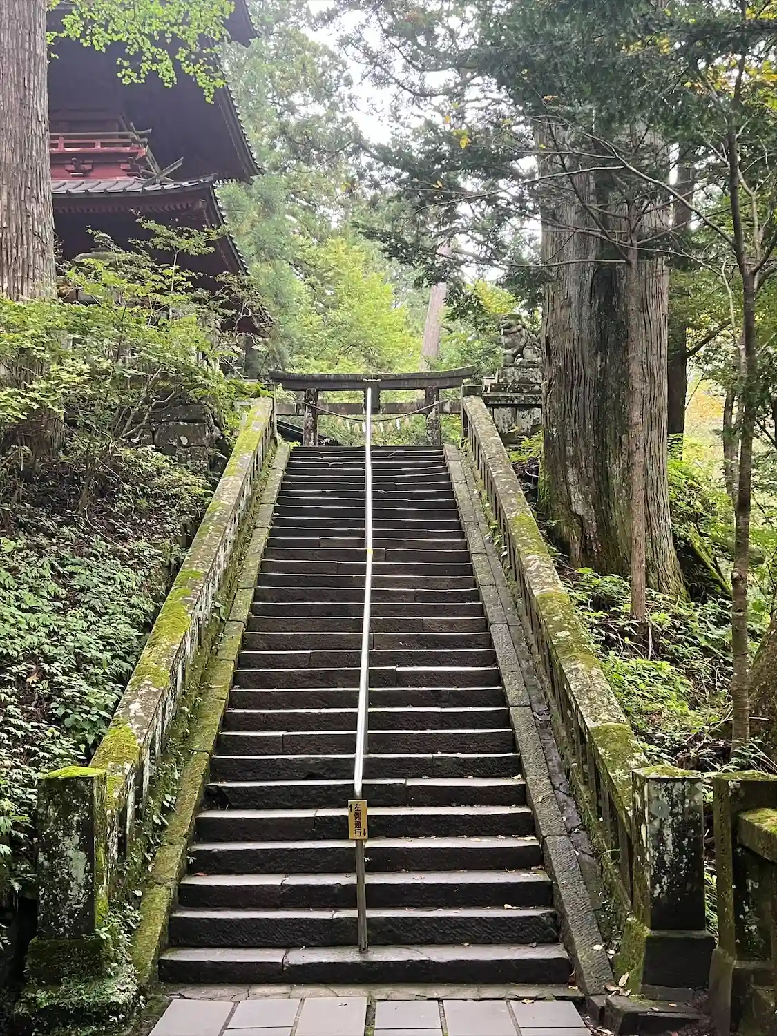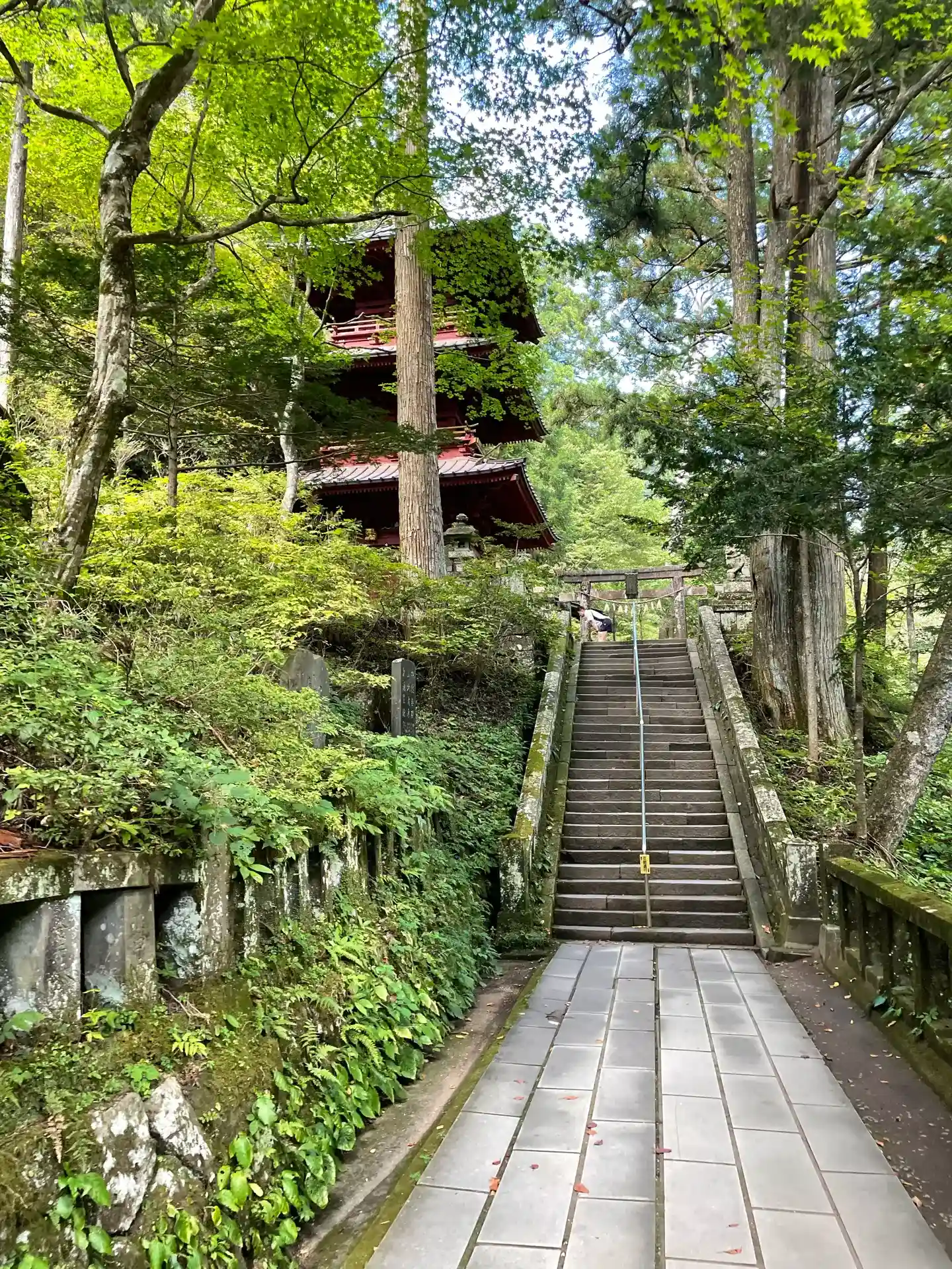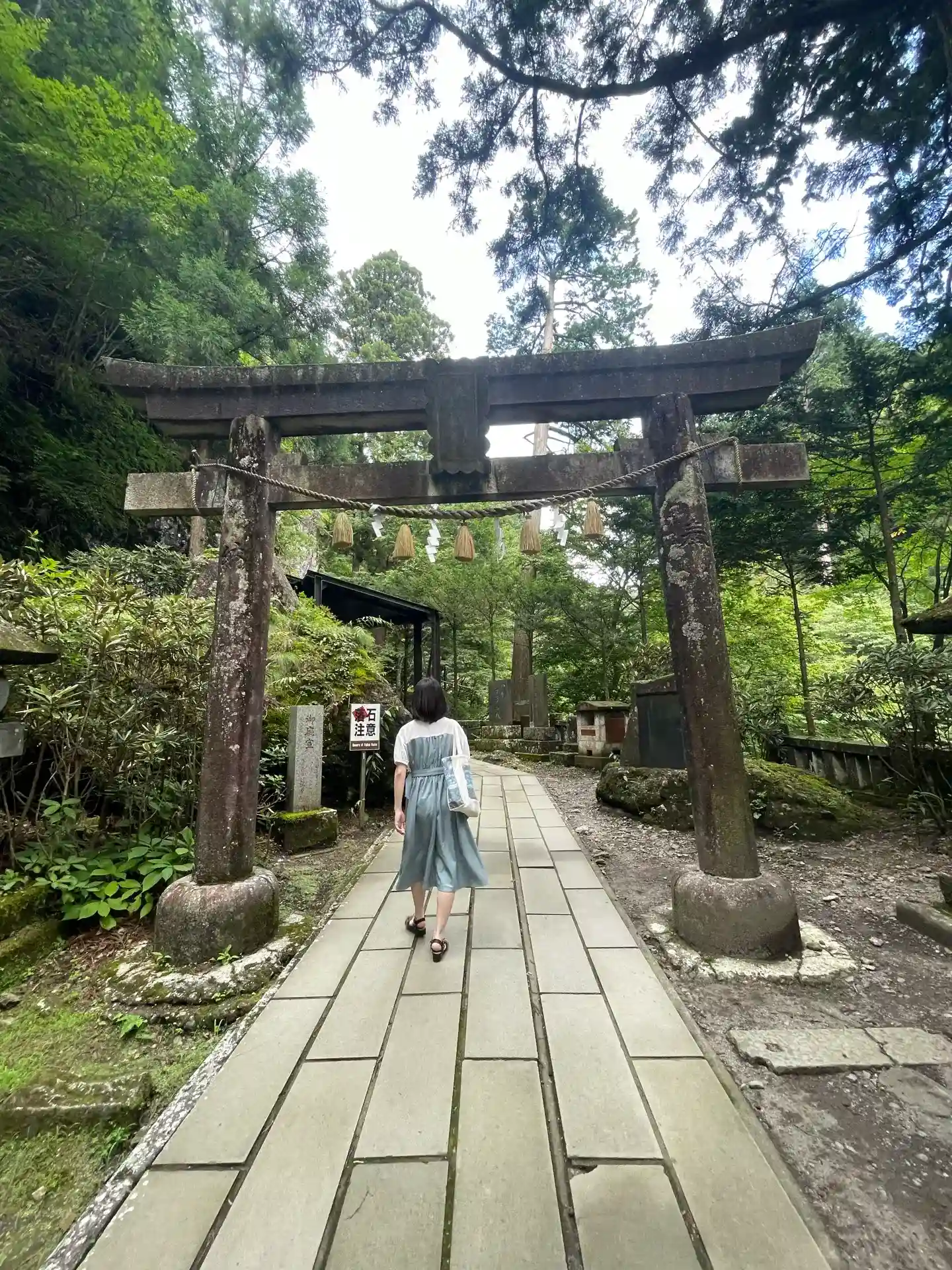 ゆるやかな登りの参道は横に流れる川の音と木々や苔むした岩に癒されながら進めます。…
