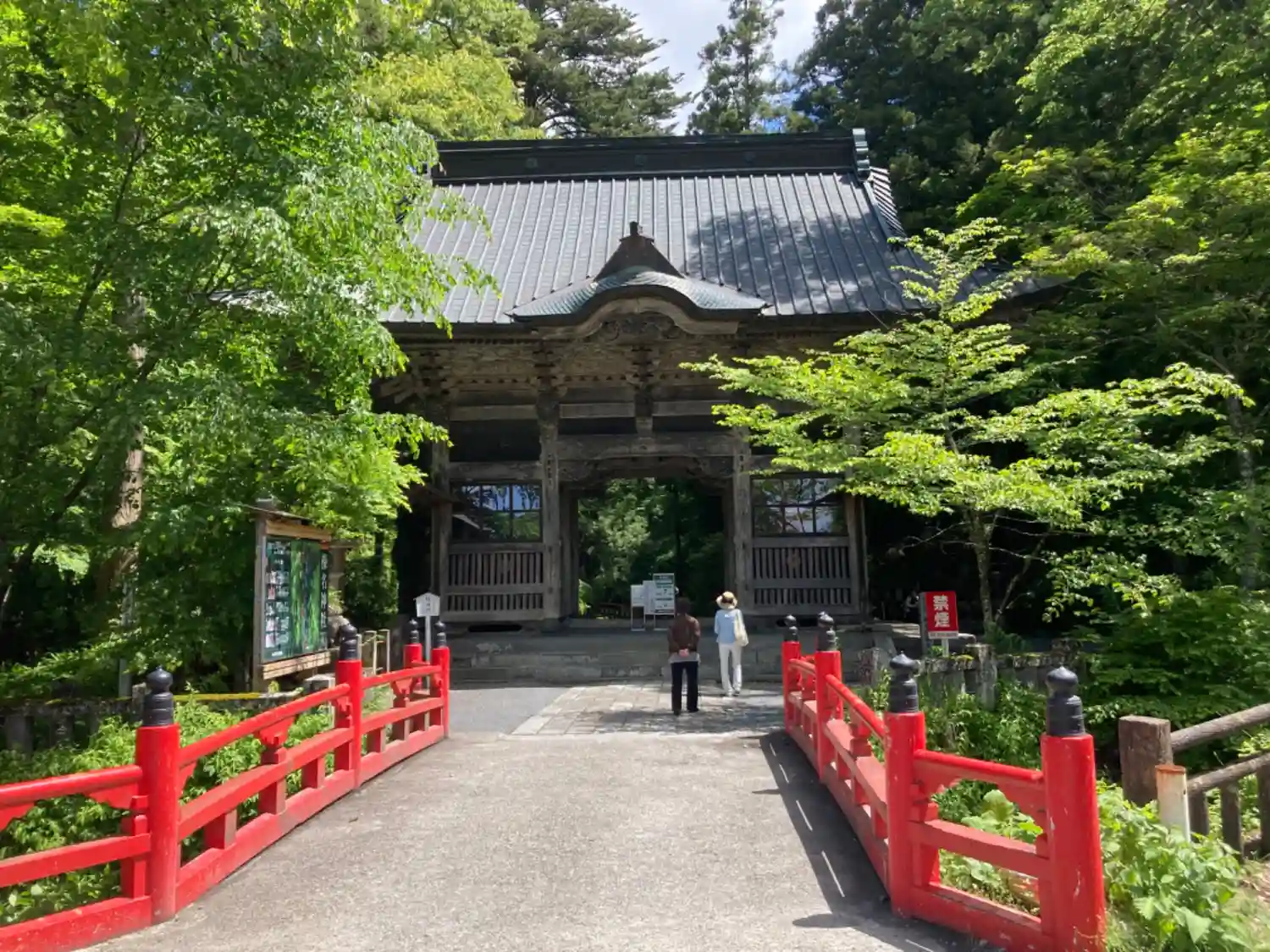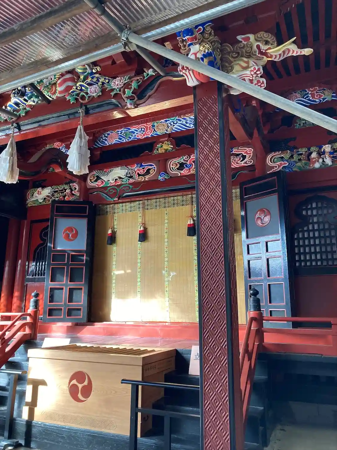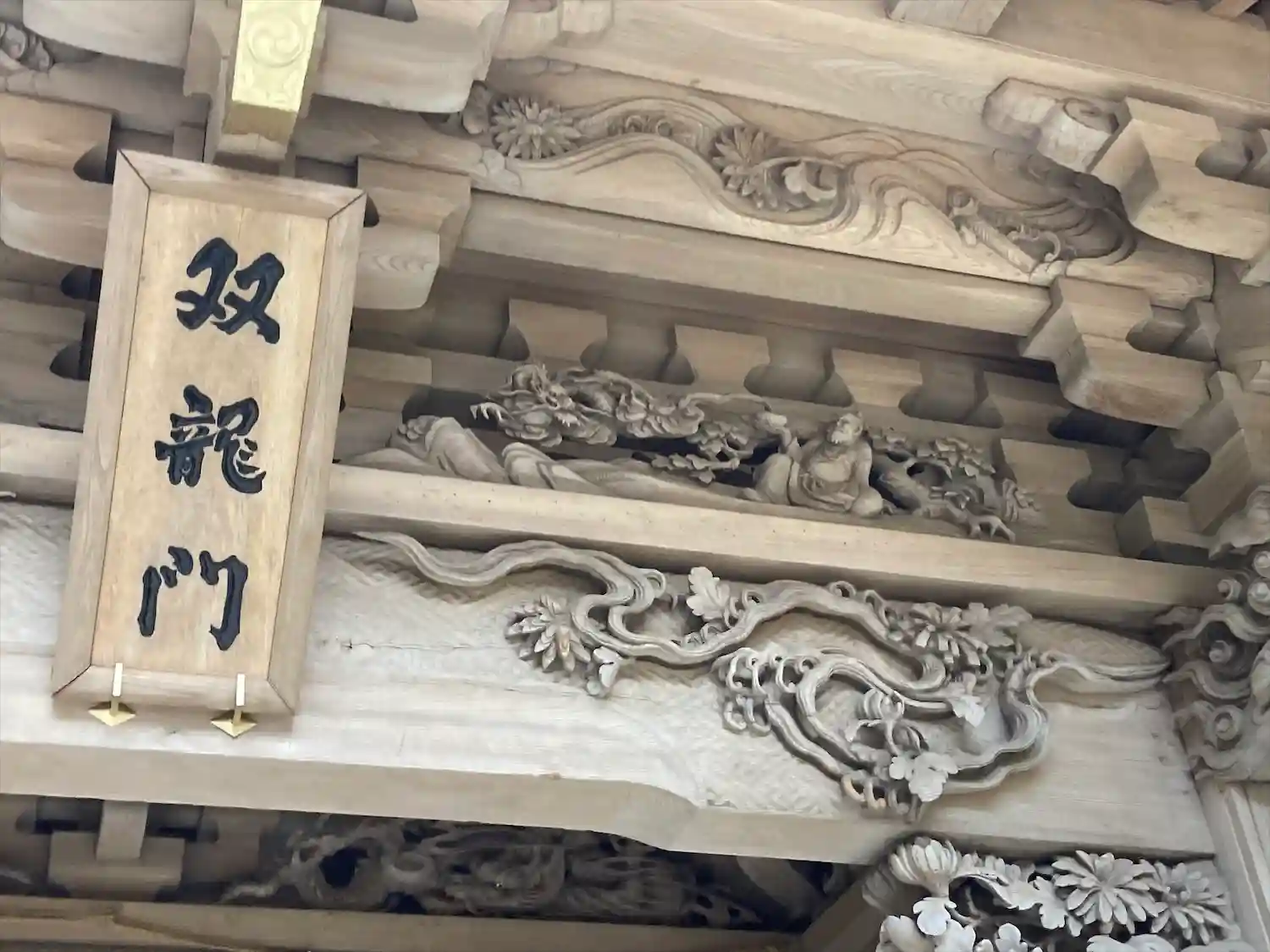 重要文化財の一つです。安政2年(1855年)の建立で、入母屋造銅板葺きの四脚門。竜の彫刻が施されていることから双龍門と呼ばれています。...との事ですが、残念ながら修繕工事中でした(´;ω;`)