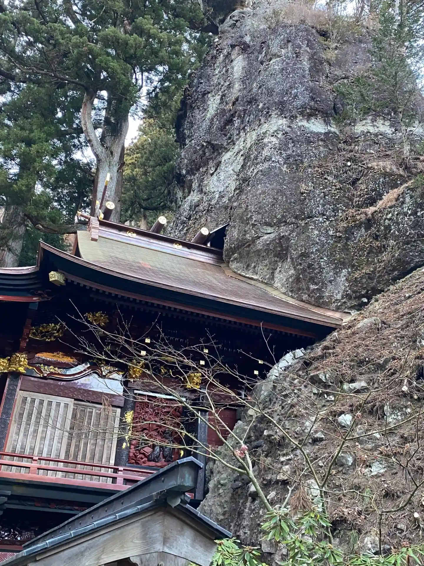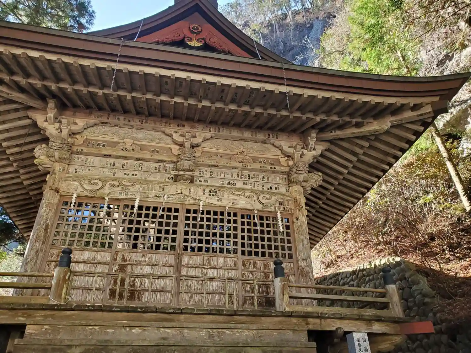 御姿岩に突き刺さる本殿。国の重要文化財。
