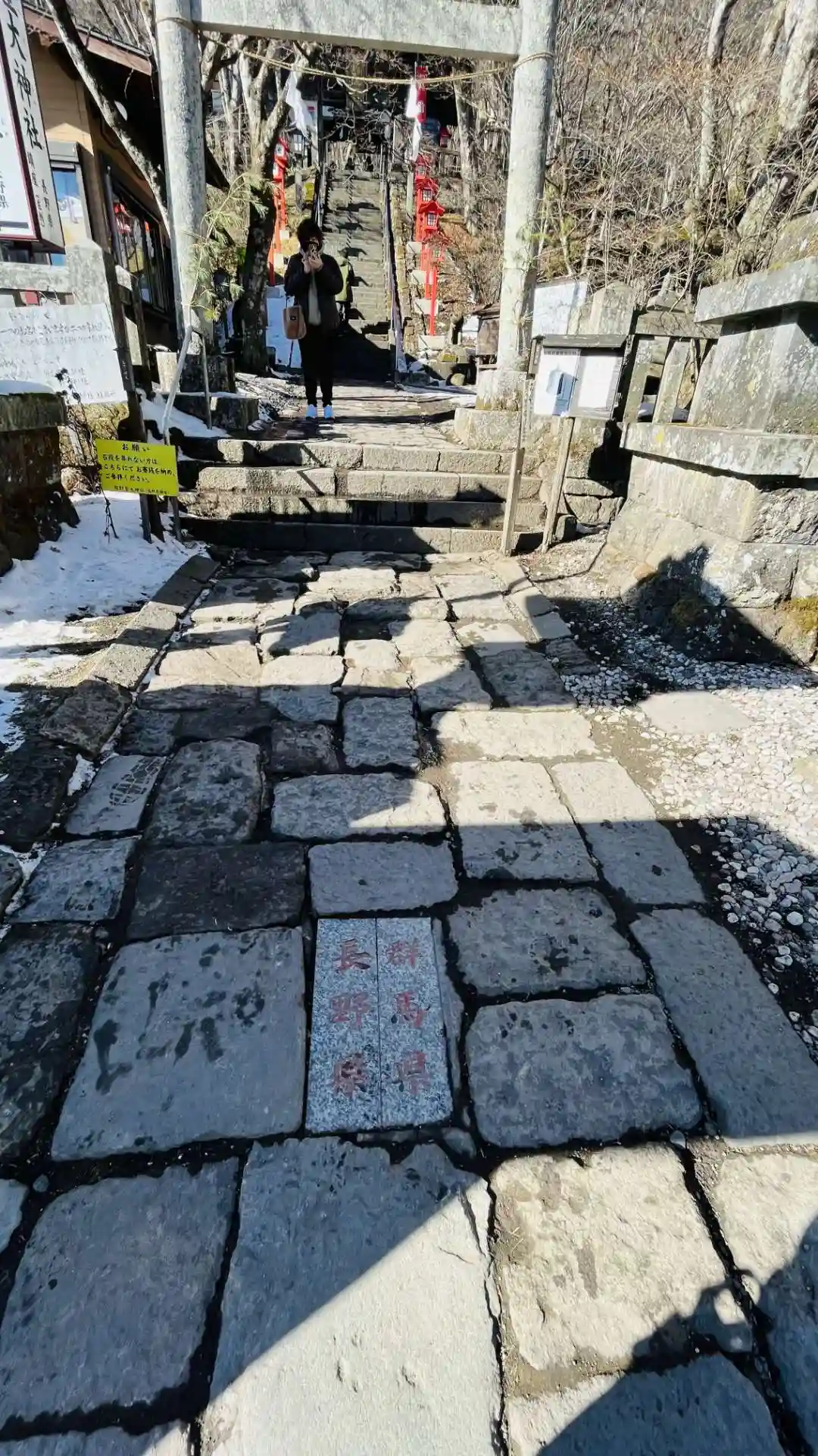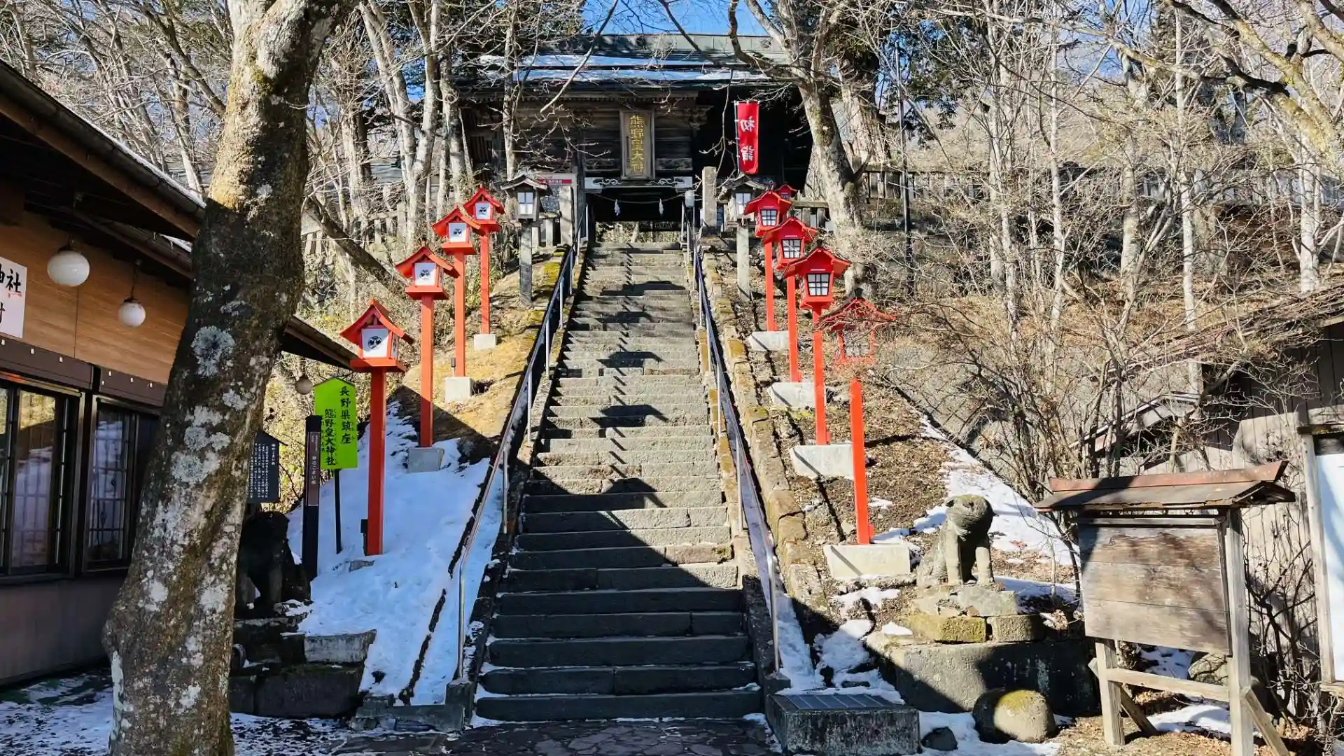 境内の真ん中に県境のラインが走っていて、左右で別の神社(群馬側の熊野神社と長野側の熊野皇大神社)をお参りできるのが面白いポイント。