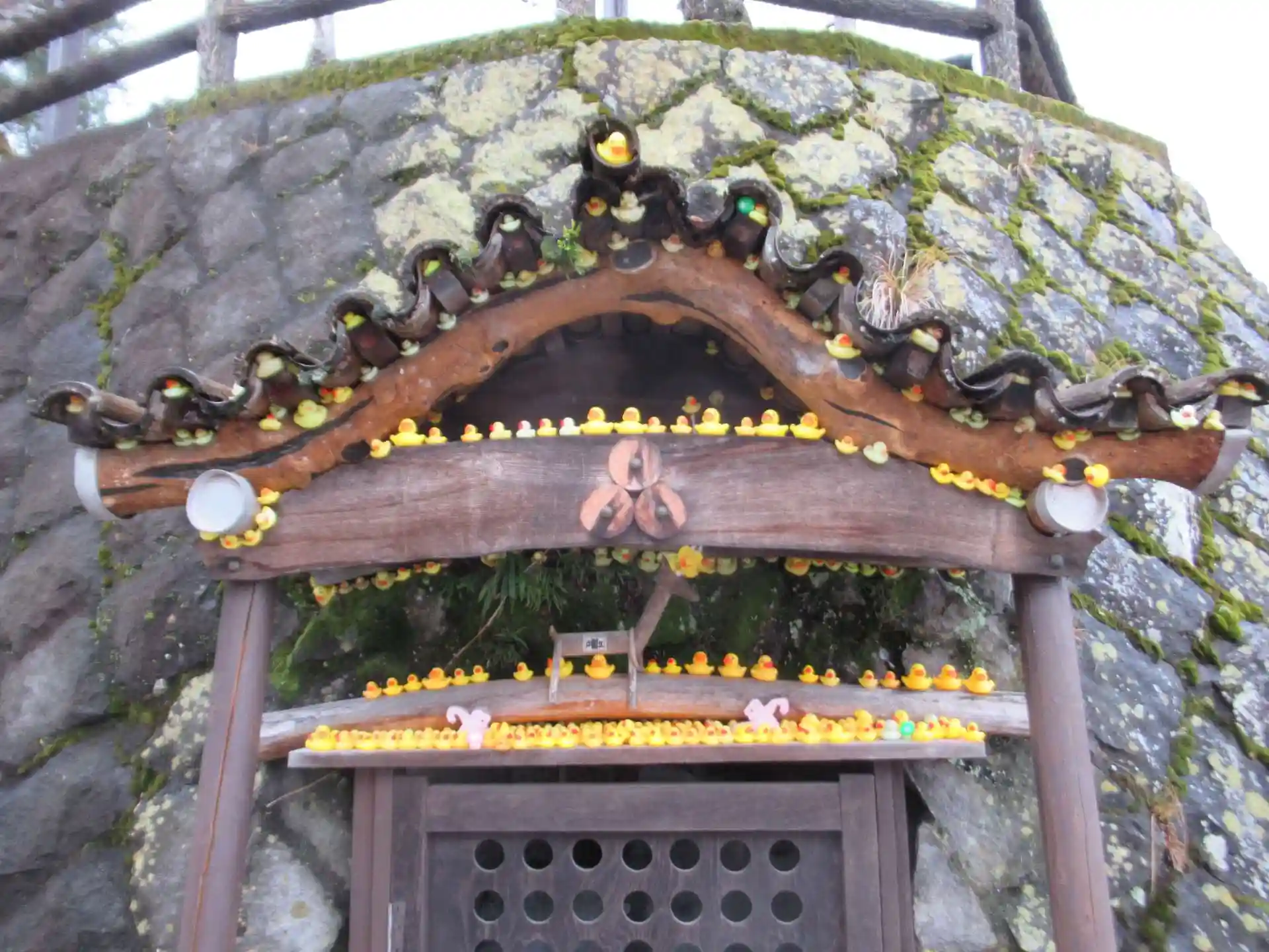 本当は地域のゴミ集積所なのです。多分景観維持で、神社風の装飾をつけたところに、射的の景品のアヒルさんを置いた人がいて、だんだん増えていってアヒル神社と呼ばれるようになったようです。