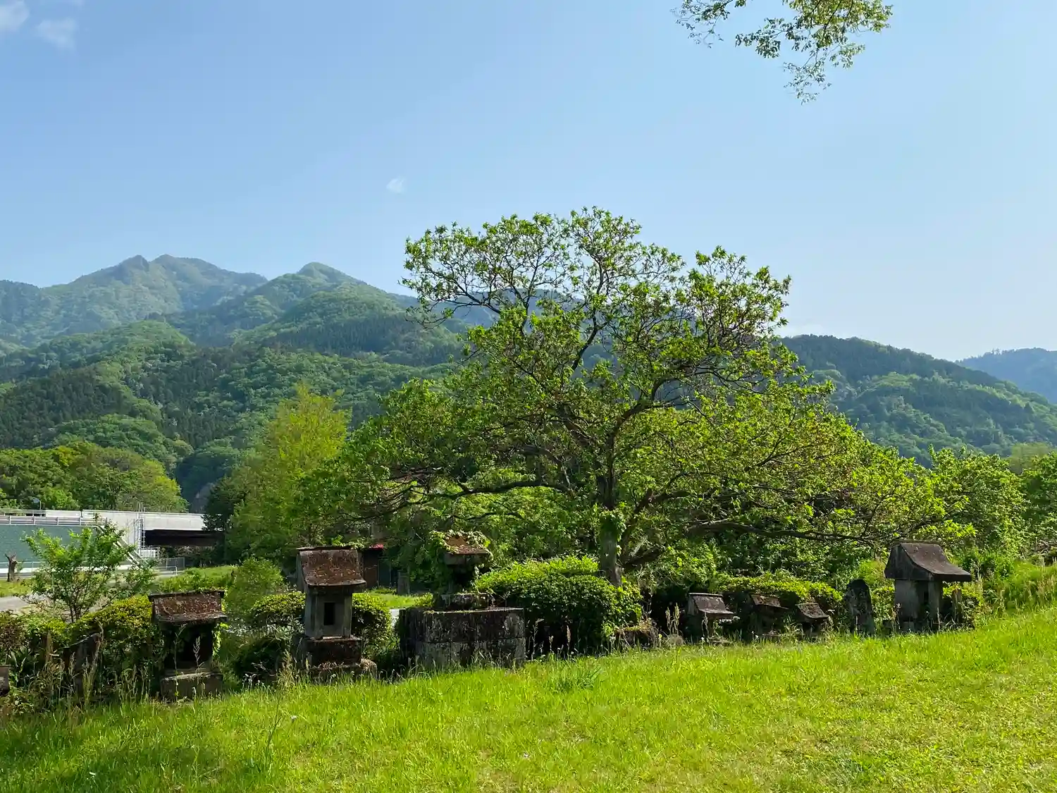 拝殿から右側を見ると、境内地は緑に覆われ、奥の山々と相俟って、自然豊かなすがすがしい景観。