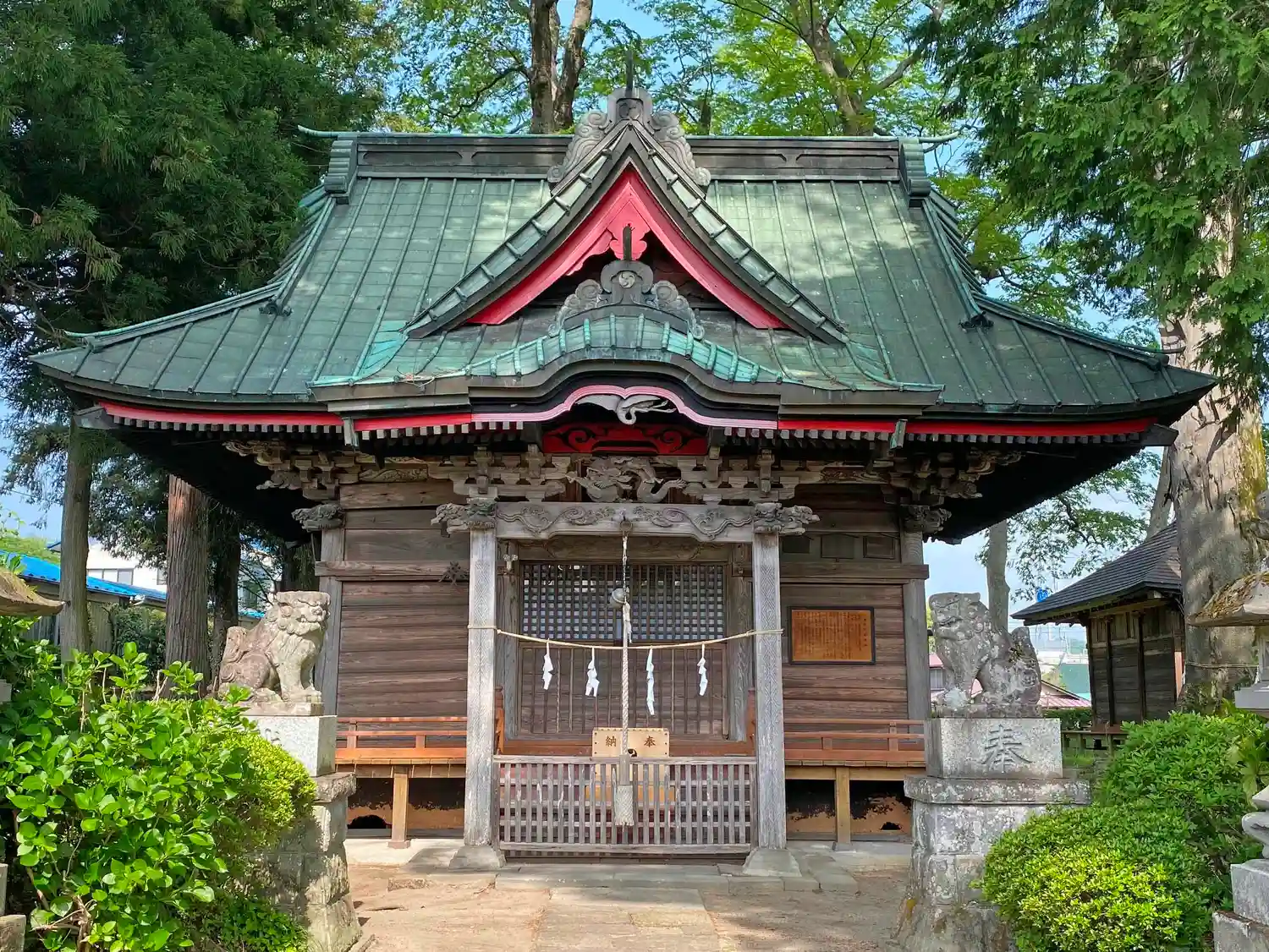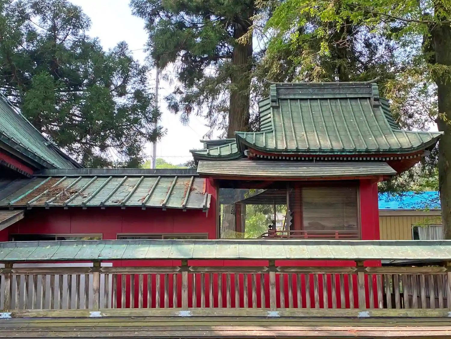 <拝殿>全景。銅板葺屋根のグリーンと刺し色の赤のコントラストがきれい。