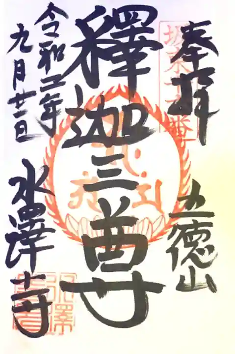 真ん中に釈迦三尊と書かれ、右上に坂東十六番の印、右下に五徳山の文字、真ん中には蓮華座に梵字(釈迦如来、文殊菩薩、普賢菩薩)の火焔宝珠印、左下に水澤寺の文字、水澤寺印が押されています。