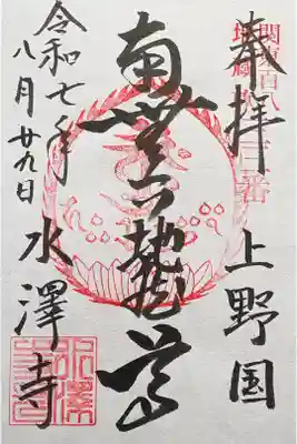 真ん中に釈迦三尊と書かれ、右上に坂東十六番の印、右下に五徳山の文字、真ん中には蓮華座に梵字(釈迦如来、文殊菩薩、普賢菩薩)の火焔宝珠印、左下に水澤寺の文字、水澤寺印が押されています。