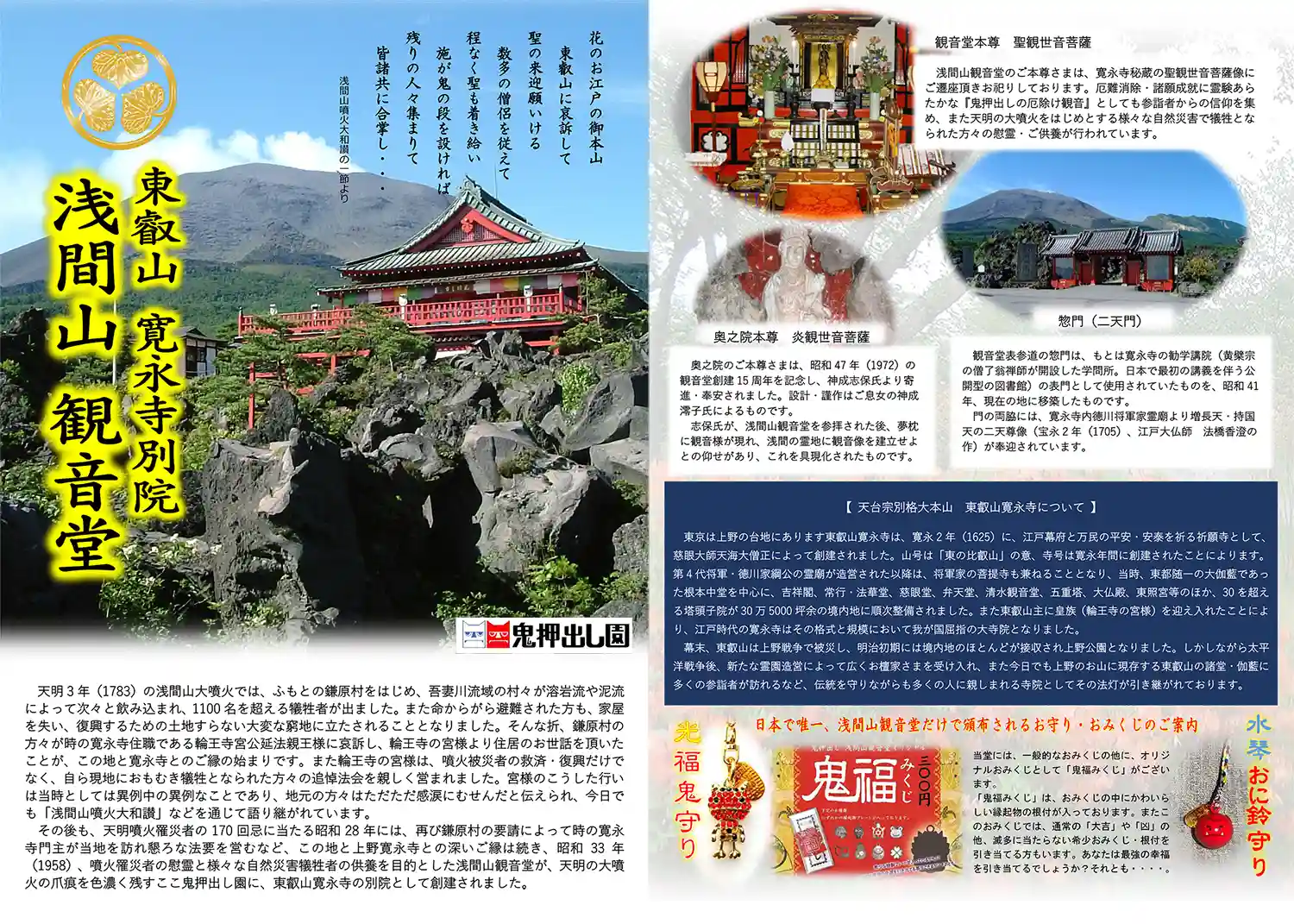 天明の大噴火の際、鎌原村にあった寛永寺の末寺である延命寺も埋没してしまい、生き残った93人の救済を当時の寛永寺の住職が命じ、多くの僧侶が鎌原に訪れ犠牲者の供養を行ったと言われています。そういったご縁により、昭和33年鬼押出し園内に東京都上野にある東叡山寛永寺より聖観世音菩薩をお迎えし、浅間山観音堂が創建されました。厄難消除・諸願成就「鬼押出しの厄除け観音」として今もなお参詣者から信仰されています。(引用)