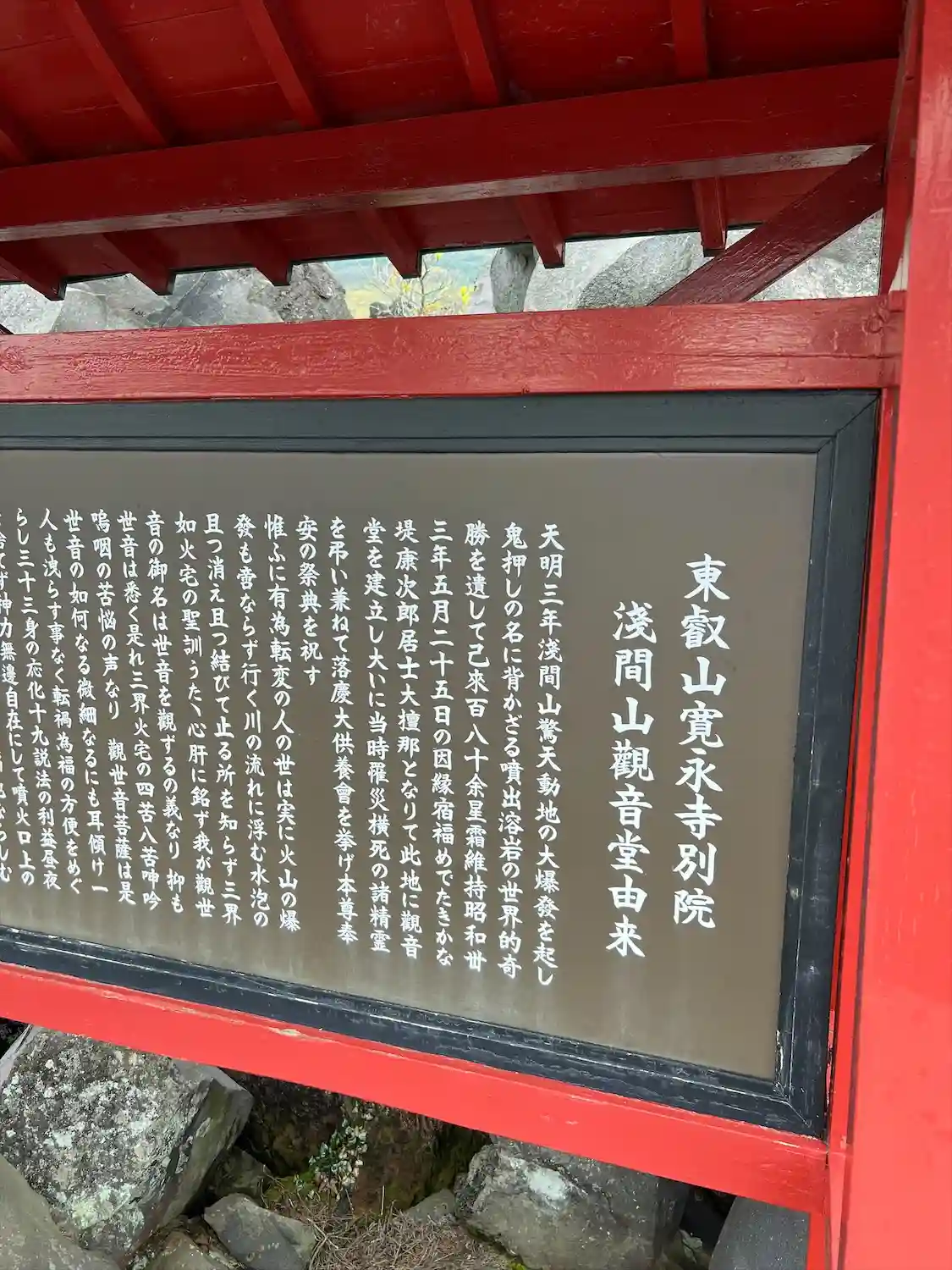 奇岩群の中のお堂 後ろに浅間山