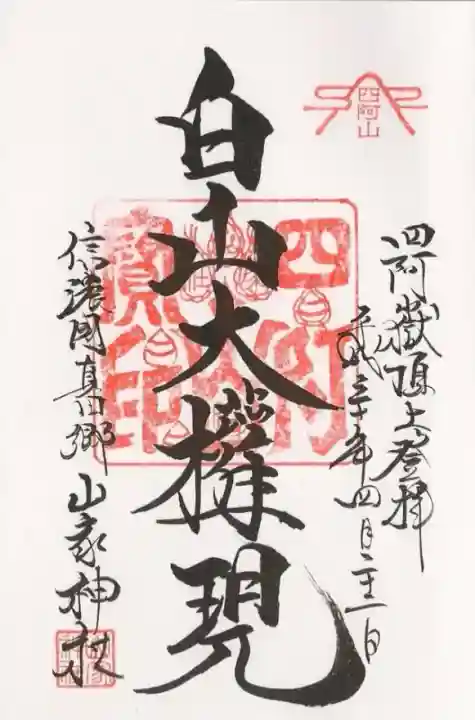 白山大権現と楷書で書かれ、右上には四阿山の印が押されている御朱印です。