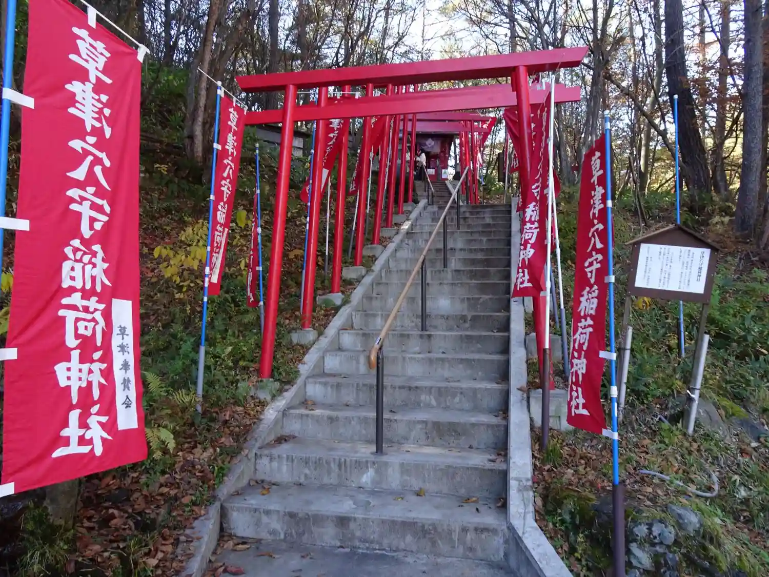 草津へ湯治に通い病気平癒した方が信仰していた穴守稲荷をこの場所に分霊し勧請したそうです。本社は東京…