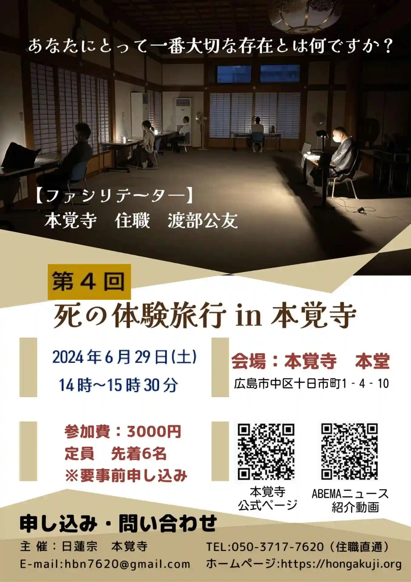 本覚寺住職は2019年に脳腫瘍と診断され、2週間の入院生活を体験しました。普段からお葬式など葬送儀礼を行う立場でしたが、実際に自分自身の「死」と真剣に向き合うことになった経験を経て、2023年2月にこのワークショップを初めて受講し、大変感銘を受けました。その時、「もう少し早く受講していれば・・・・・」という思いになったと同時に、広島でも是非開催してみたい、と思いました。