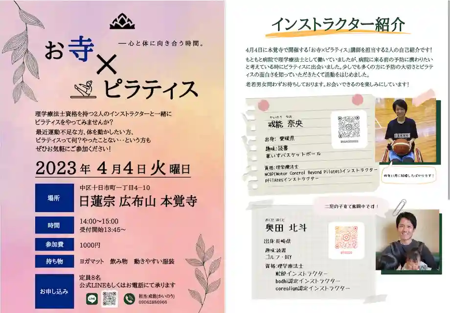 理学療法士資格を持つ2人のインストラクターと一緒にピラティスをやってみませんか?