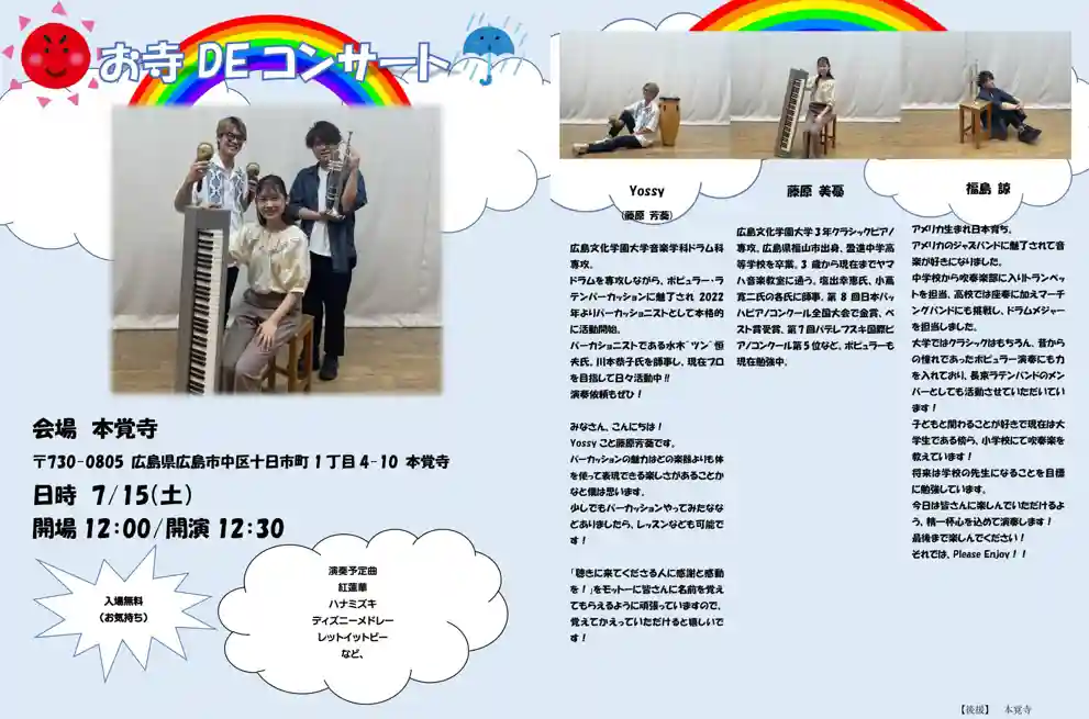 広島の大学生を中心とした、キーボード・パーカッション・トランペットの3人組ユニットによるコンサート…