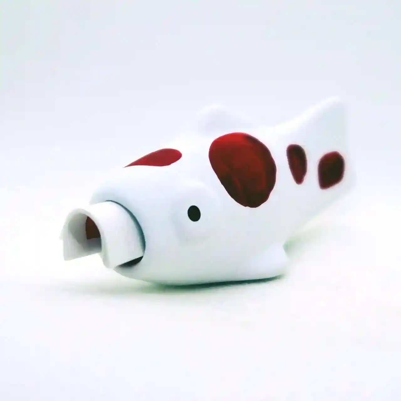 紅白のめでたい鯉、尾びれが左側に流れ泳いでいるように見えます。
