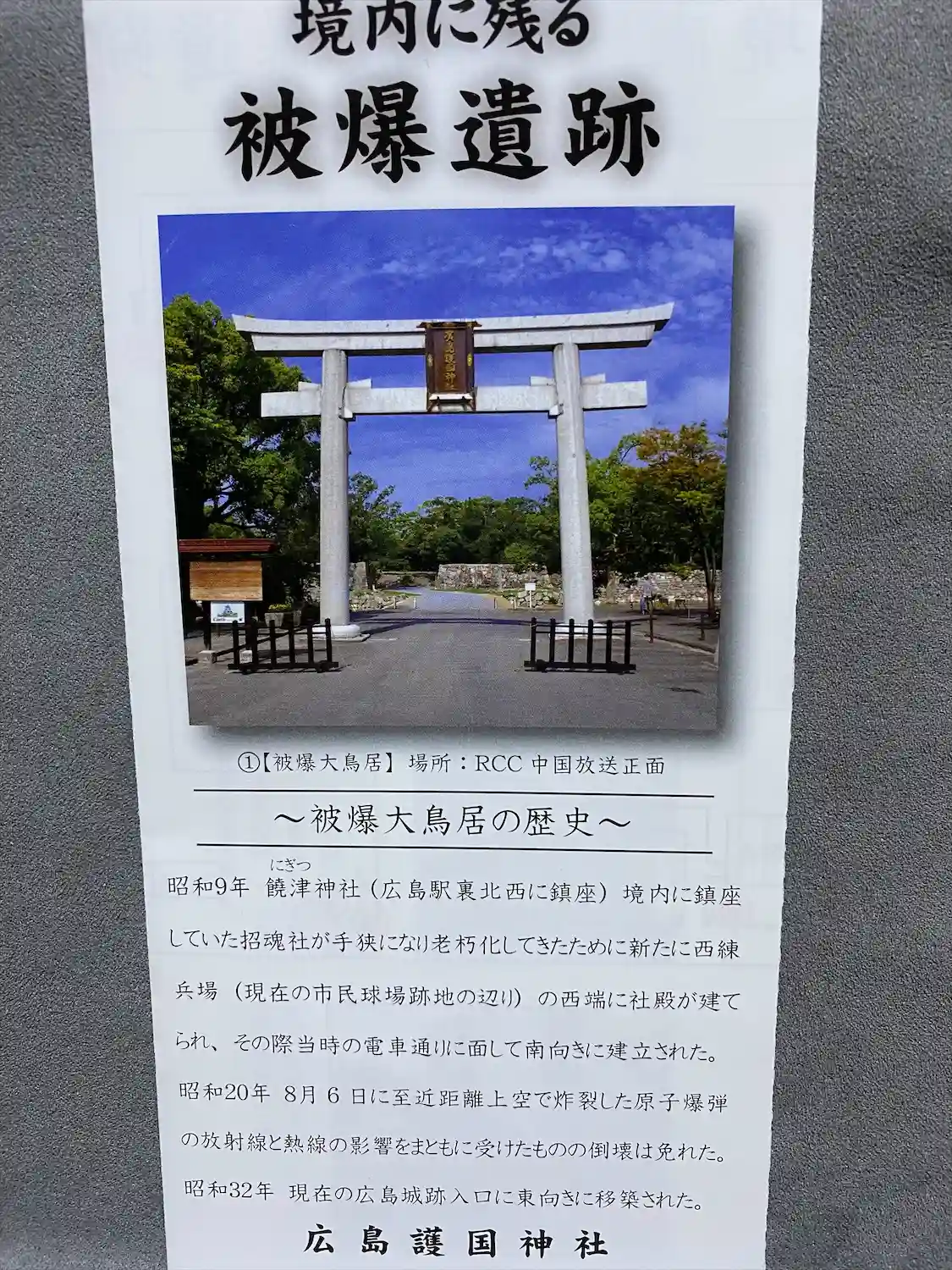広島⑩旧広島護国神社は爆心地から薬330メートルの地にあったため(現在の中津宮付近)、社殿や鳥居は…