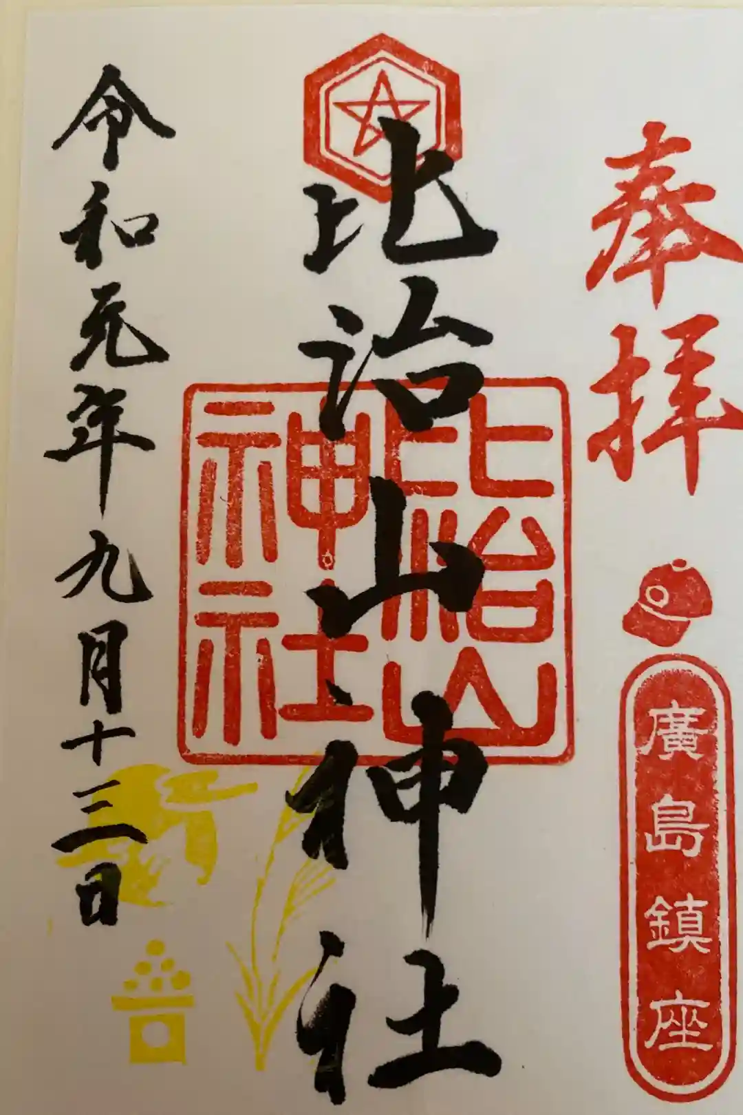 季節印,広島カープ帽付きの御朱印です。書き置きのみで季節により印が変わるようです🤗さすが広島,御朱印にもカープ愛🥰