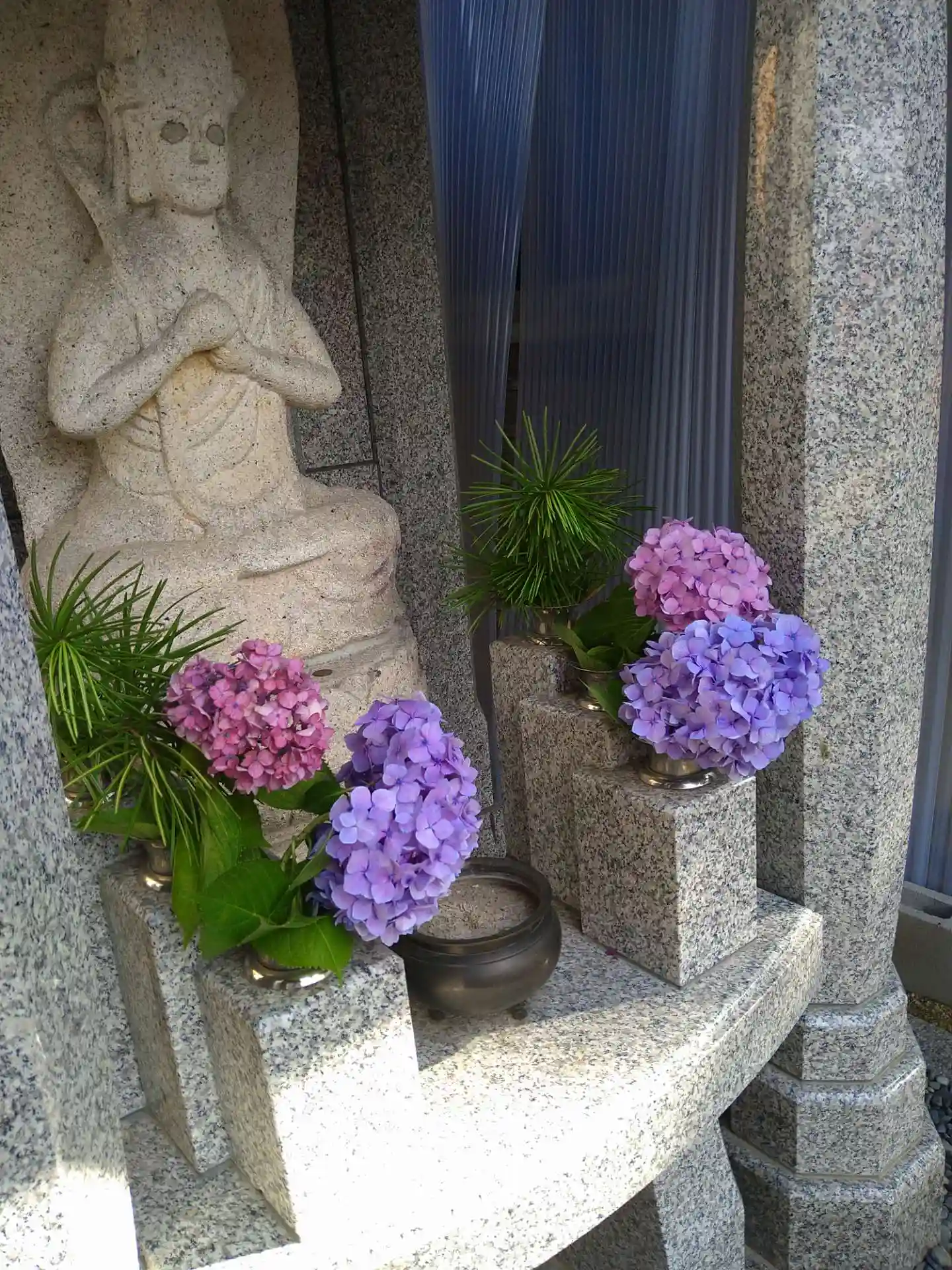 紫陽花が今年も綺麗にたくさん咲き、 当院でも流行りの花手水をしてみました。