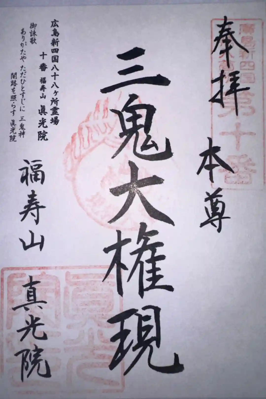 | 広島新四国八十八ヶ所霊場 第10番 | ご本尊・ご祭神:三鬼大権現 御真言: おん あらたんのう うんそわか 御詠歌: ありがたや ただひとすじに 三鬼神 闇路を照らす 眞光院 |