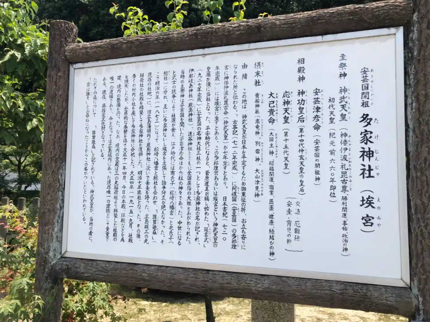 | ご祭神 | 《主祭神》 神武天皇 安芸津彦命 《配祀神》 神功皇后 応神天皇 大己貴命 | |