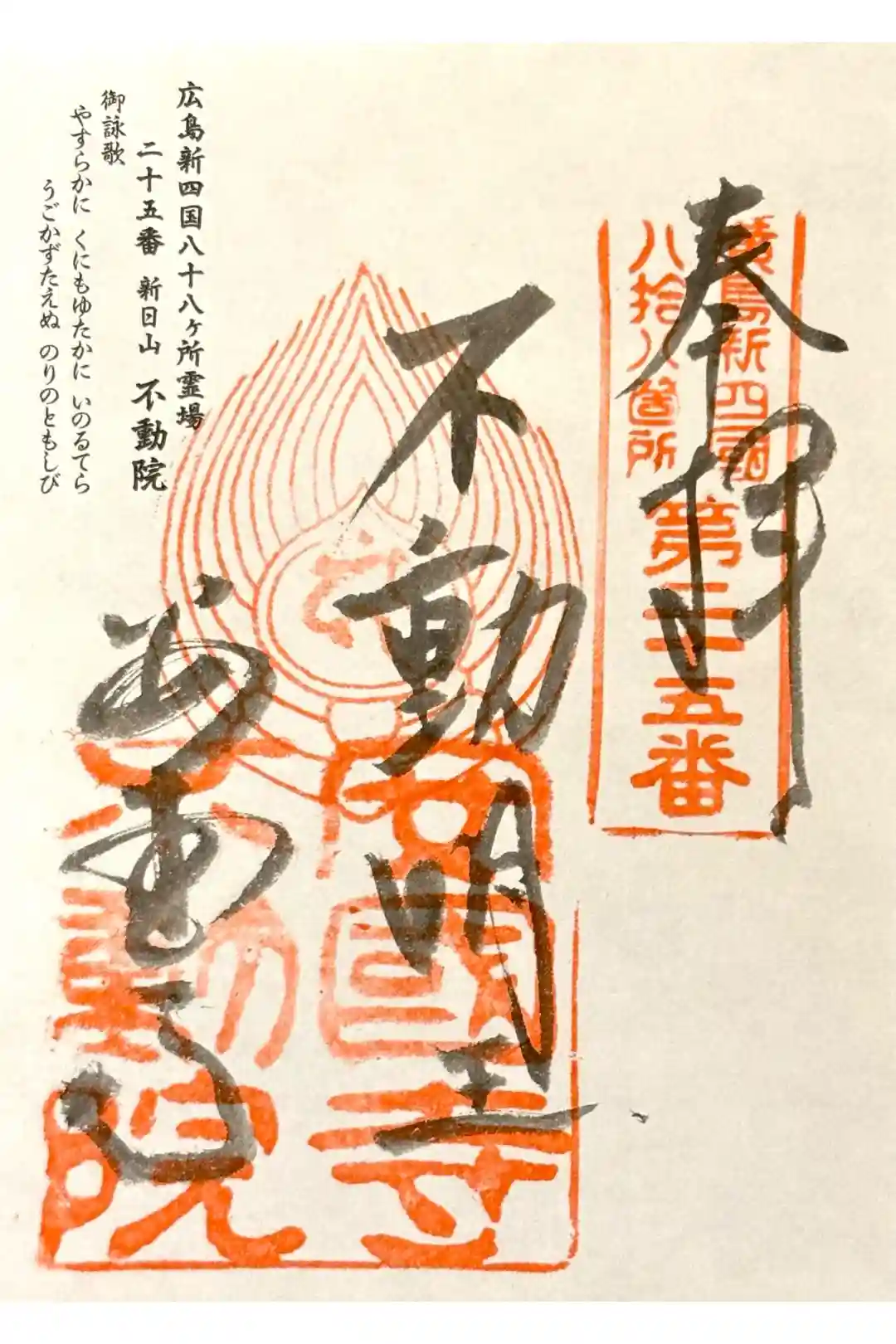 | 広島新四国八十八ヶ所霊場 第25番 | 仏さま:大聖不動明王 御真言: なうまくさんまんだ ばざらだんせんだん まかろしゃだ そわたや うんたらた かんまん 御詠歌: やすらかに くにもゆたかに いのるてら うごかずたえぬ のりのともしび |