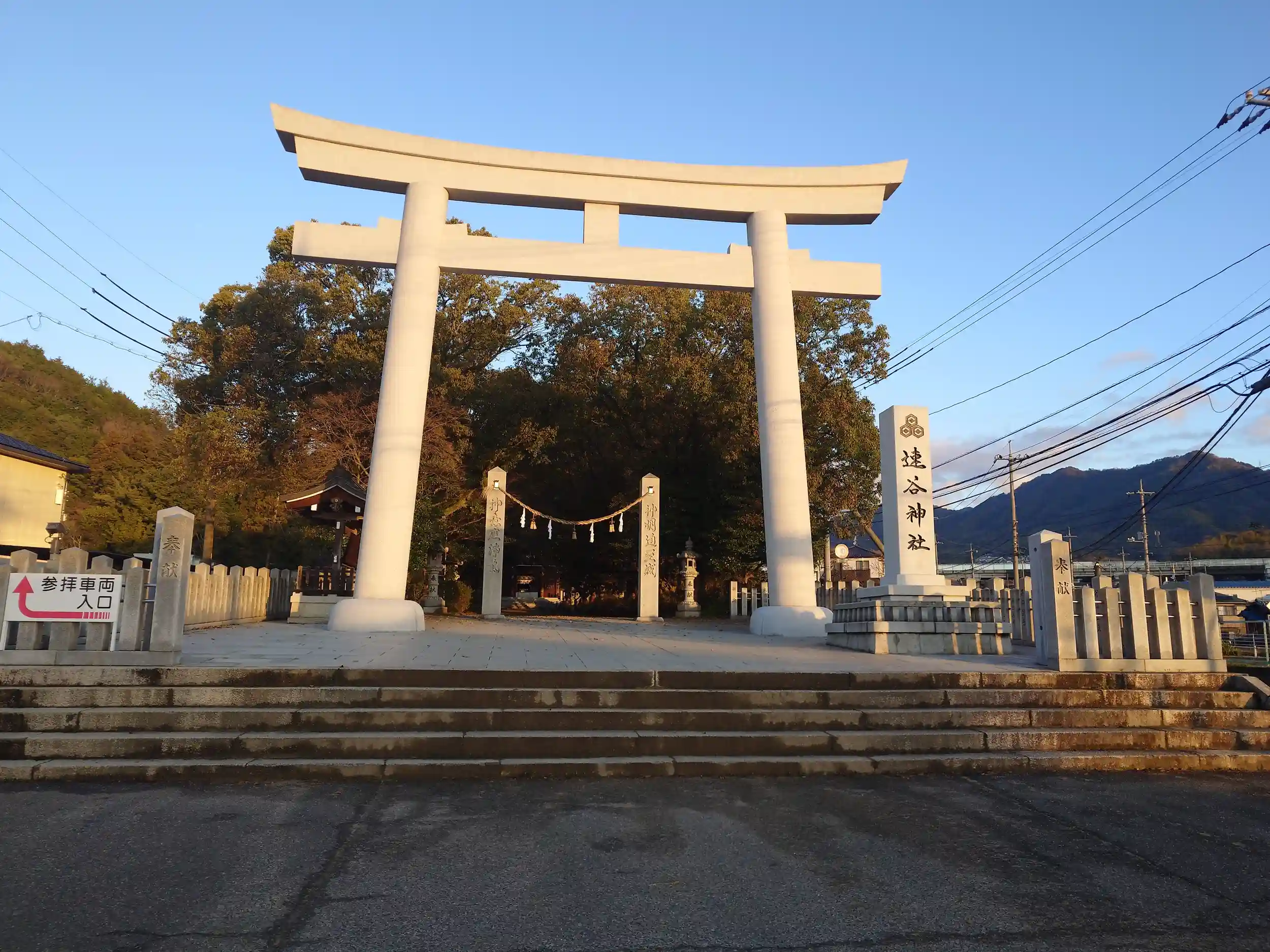 鳥居と社号標です。日の光に照らされています。