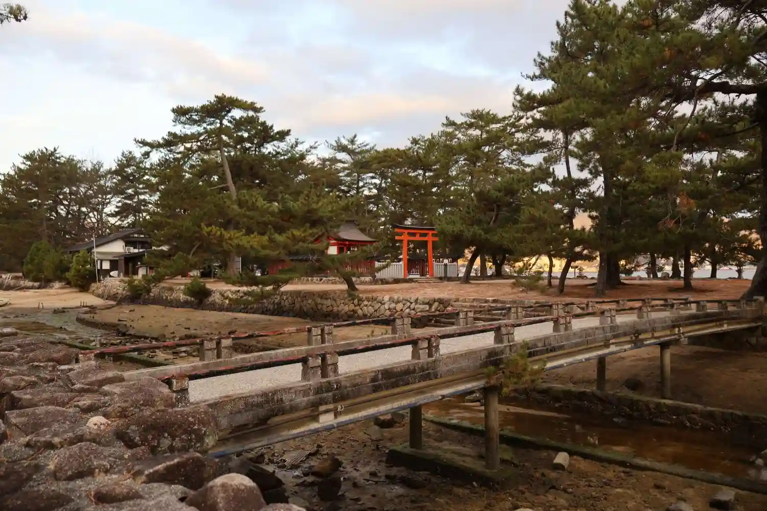 西松原から見た<厳島神社の大鳥居>。よく見る写真の逆サイドバージョン。