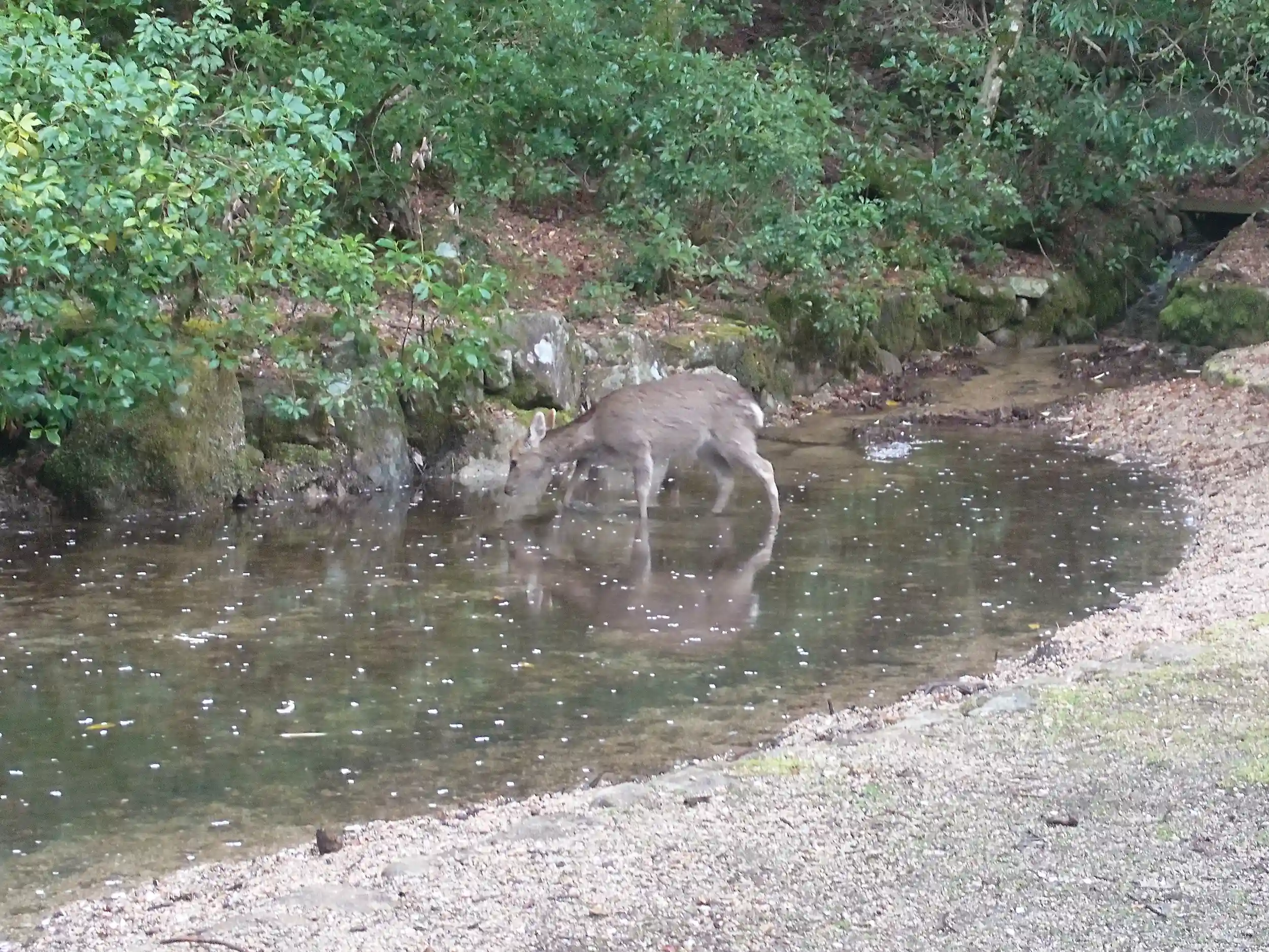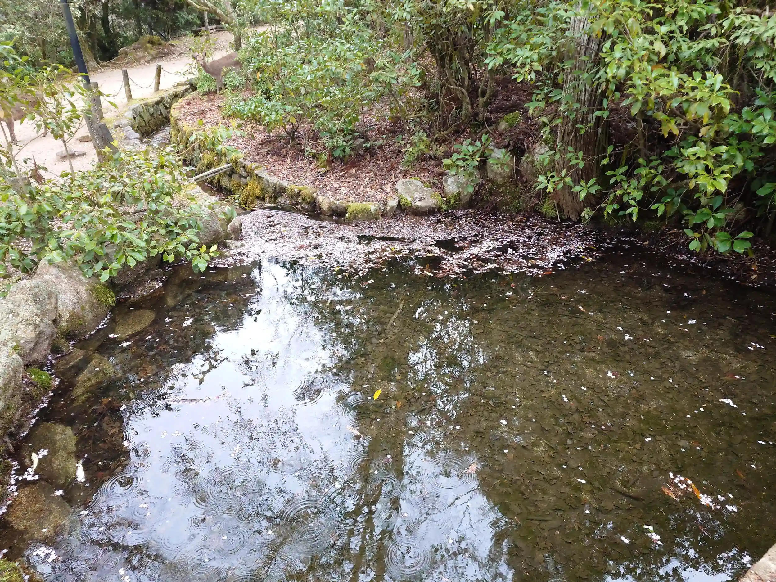 池の中に鹿さんがいらっしゃいました。花びら食べてる?