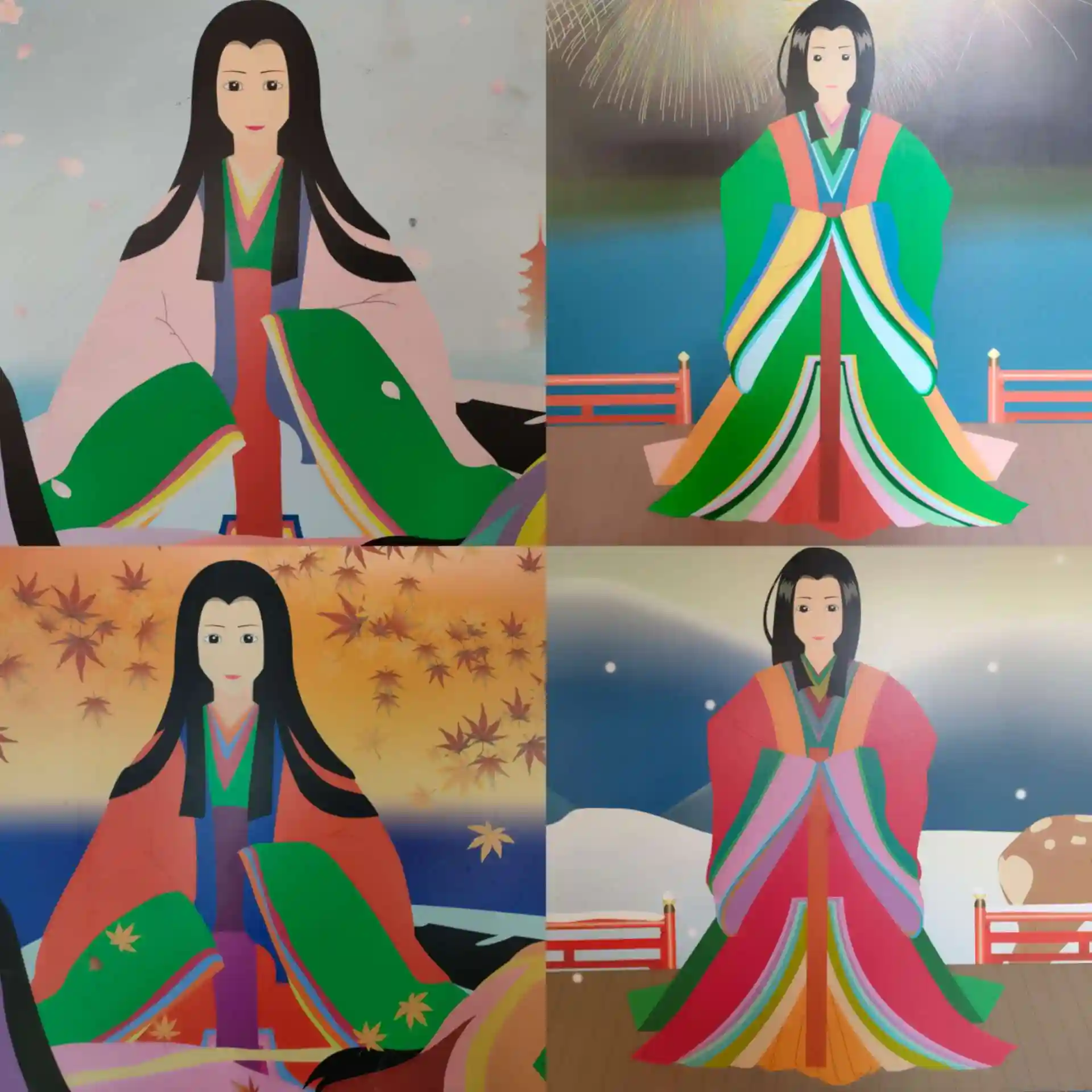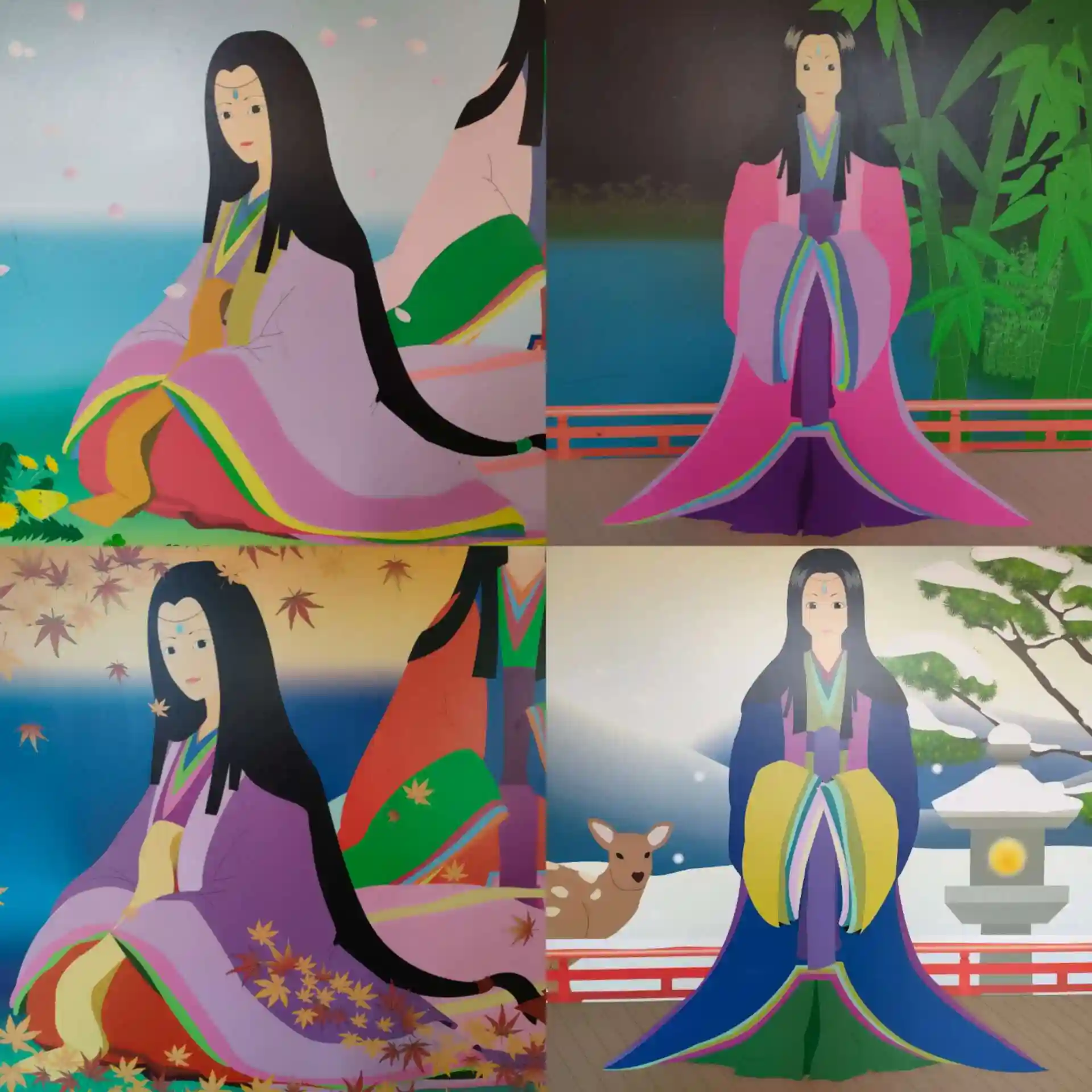 このイラストは宮島三女神物語と名前がつけられ、2008年に夏バージョンと秋バージョンを宮島口のお砂焼まつりの際に公開。2009年には春バージョンと冬バージョンを公開した。