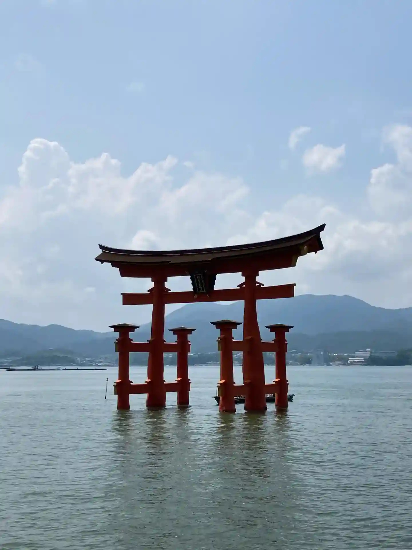 フェリーに乗って向かっていると、少しずつ見えてくる海辺の鳥居。その先に見える朱色の社殿。近づくにつれ、その綺麗な景色による期待が高まっていきました。