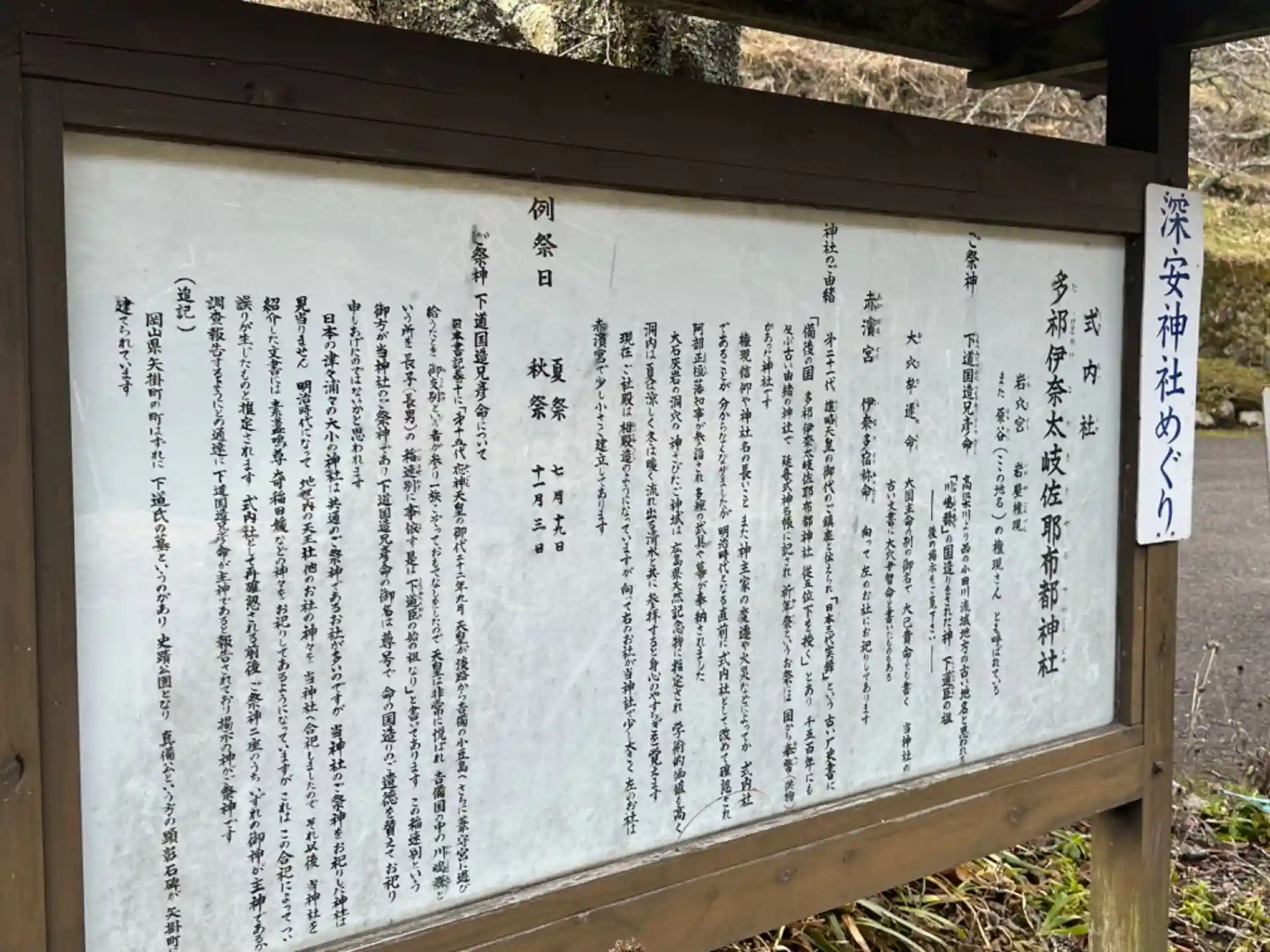 興味深いのは、下の由緒書きには御祭神は下道国造兄彦命さま、大穴牟遅命さまの二柱とありますが、ここでは素戔嗚尊さまと奇稲田姫命さま、そして倭建命さまを相殿としています。全く違っていますね。
