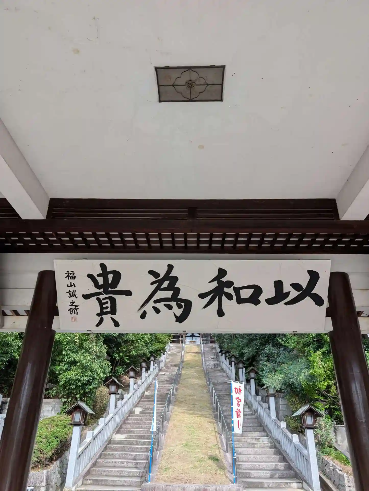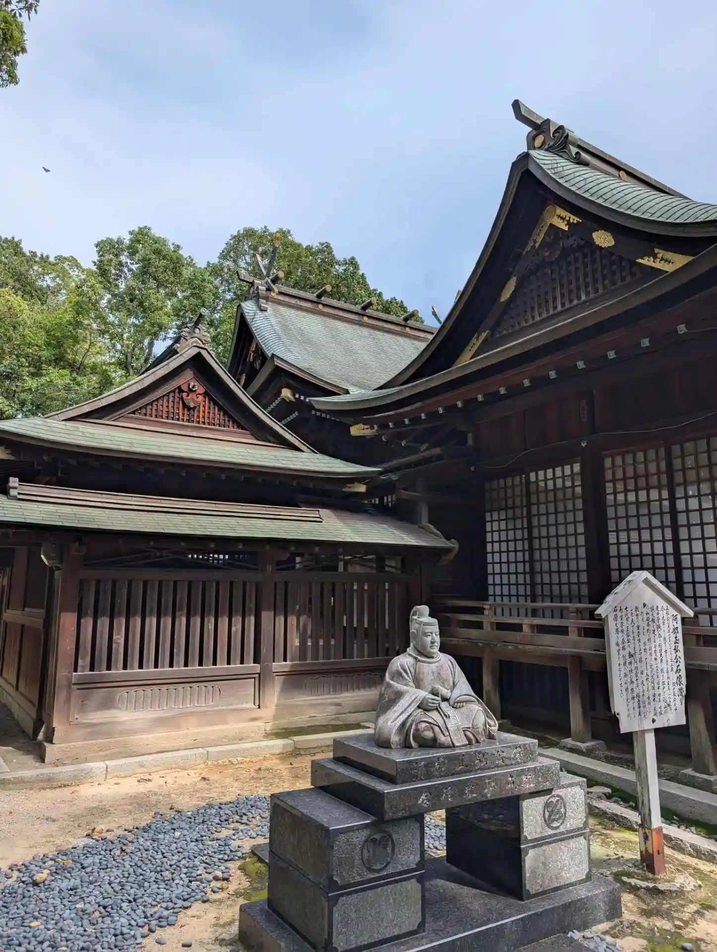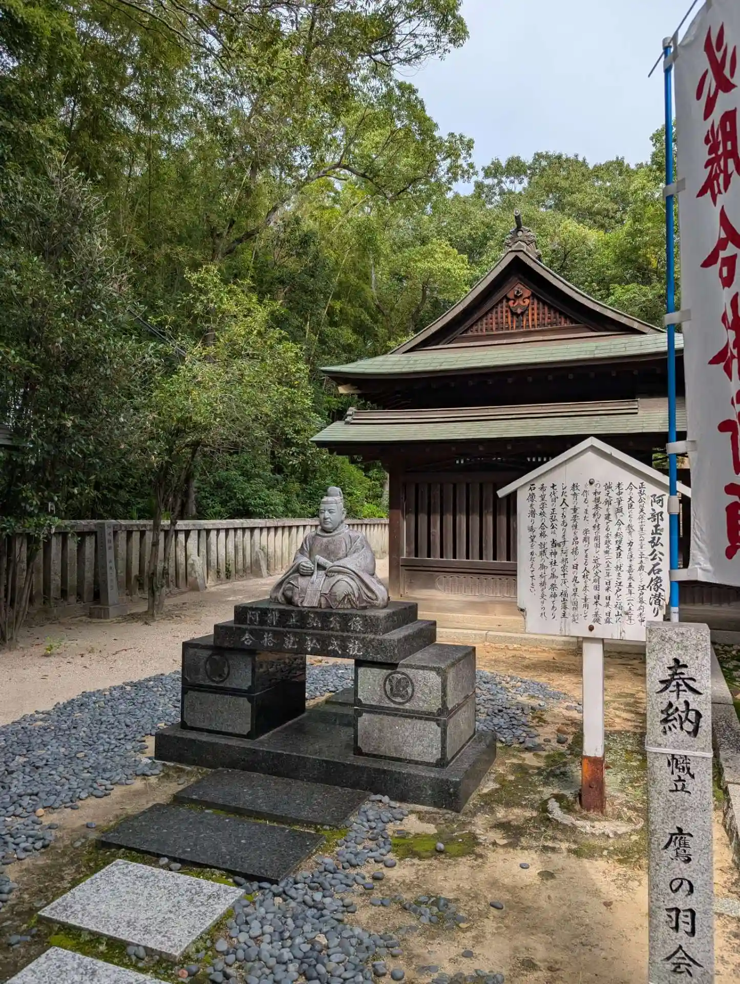 そのため神門も二つありどちらからでも同じ社殿に着き、拝殿近くには阿部正弘像(藩校「誠之館」を設立、教育に力を注ぎ、25歳の若さで江戸幕府の老中となってます)や宮本武蔵の腰掛岩(武運長久のパワースポットとされてます)も在ります☺️