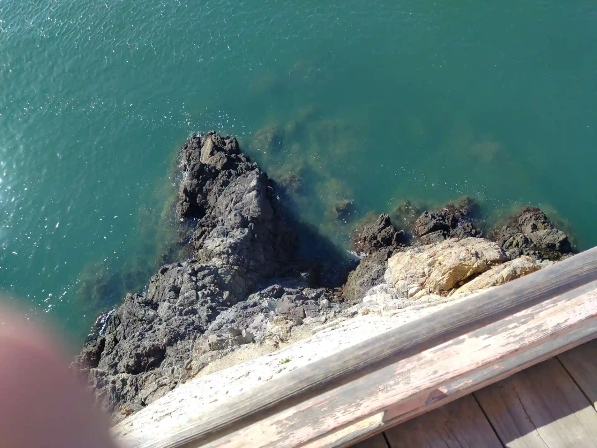 お堂をぐるりと囲む歩廊は外に向けて少し傾斜していて、しかも手摺りが低く、下を望むと断崖と海で怖さを隠せません。。。